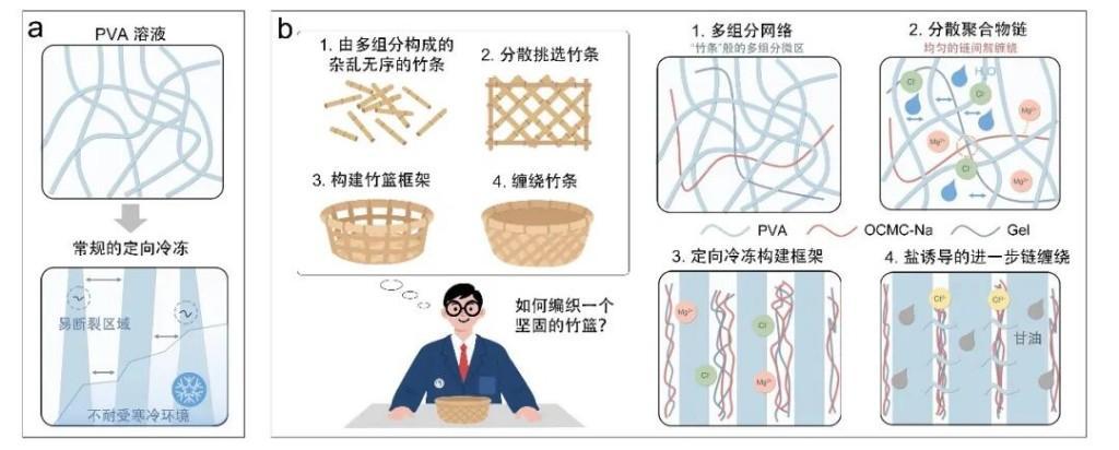 得益于竹条的多组分集成及独特编织过程,竹篮具备出色的功能性。受此启发,研究团队提出了一种水凝胶调制策略,并阐释了逐步氢键调制的详细机制。该调制策略就是将聚乙烯醇、氧化羧甲基纤维素钠和明胶多组分构成的水凝胶中每个细小的微区视为“竹条”。制备过程中,研究人员先通过氯化镁的盐溶效应削弱氢键,将“竹条”分散;再利用定向冷冻构建稀疏交联的“框架”;最后通过柠檬酸钠的盐析效应,将框架缠绕形成“竹篮”般均匀、致密交联的PCG-x水凝胶。
