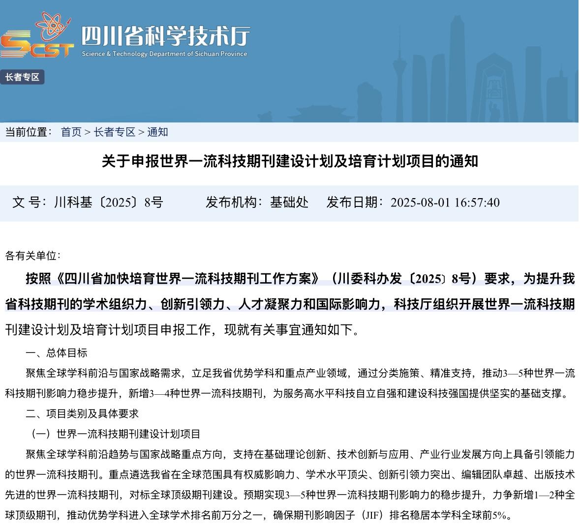 为加快推进四川省世界一流科技期刊建设,提升四川省科技期刊的学术组织力、创新引领力、人才凝聚力和国际影响力,四川省科学技术厅2025年7月制定了《工作方案》。以提升科技期刊学术质量和国际影响力为主线,分类施策、重点突破,加快培育一批世界一流科技期刊,为服务高水平科技自立自强和建设科技强国提供坚实的基础支撑。