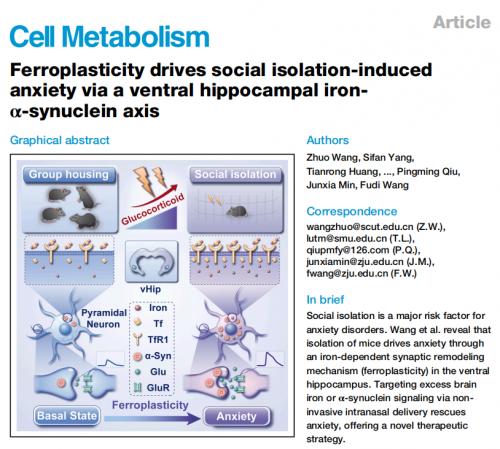 长期社交隔离不仅影响情绪,还可能在大脑中触发特定分子通路,诱发焦虑。近日,华南理工大学、浙江大学等团队在《细胞·代谢》发表研究,首次提出“铁可塑性”(ferroplasticity)概念,揭示社交隔离如何通过腹侧海马(vHip)神经元驱动焦虑。