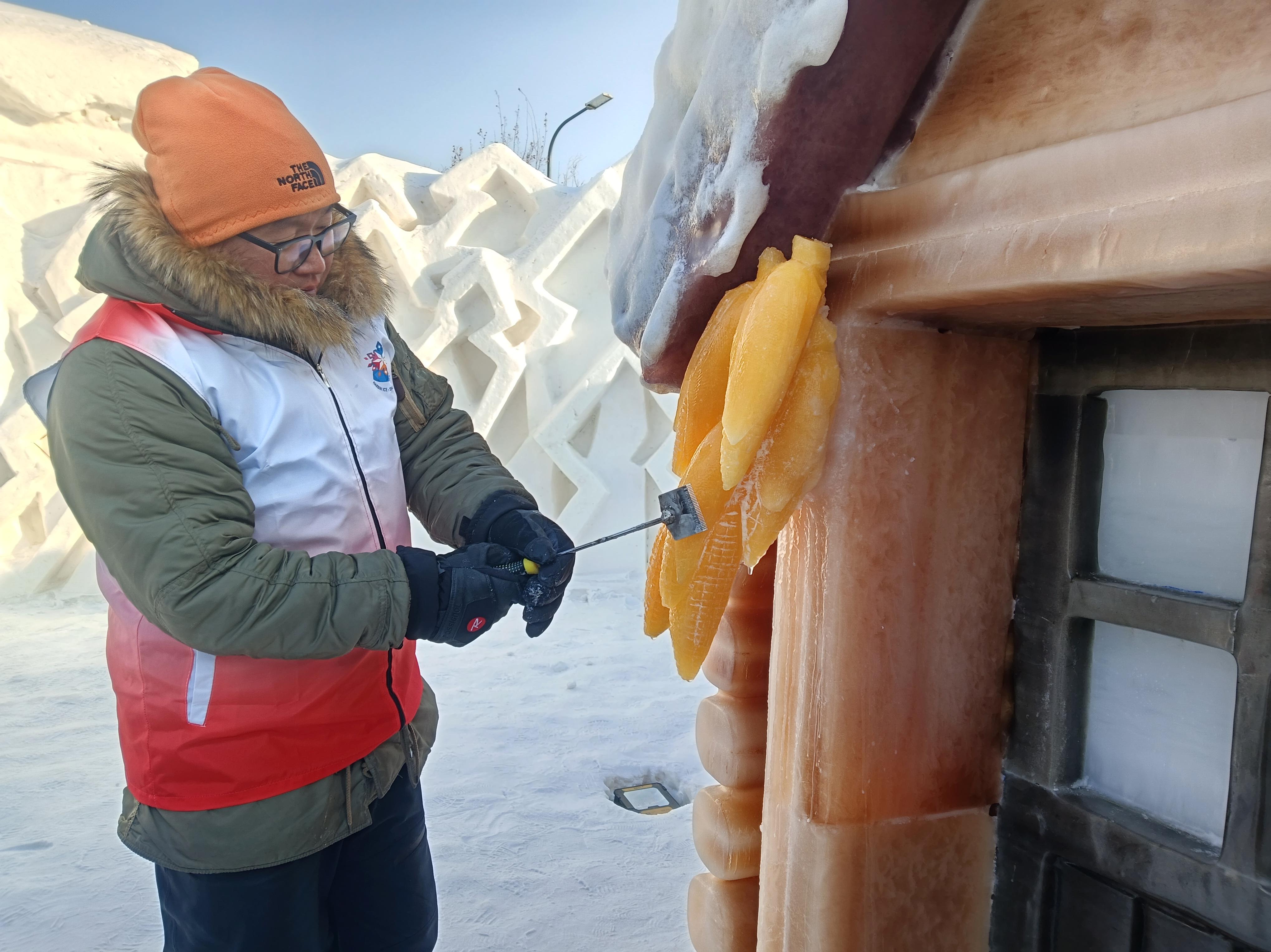 值得一提的是,植物彩色冰的物理特性也十分适配雕刻需求。“它和松花江的冰特性基本一致,雕刻过程相近,但相对更易雕琢,不像传统冰那么硬。”陈文帅表示,目前该技术已基本实现中试化、批量化生产。