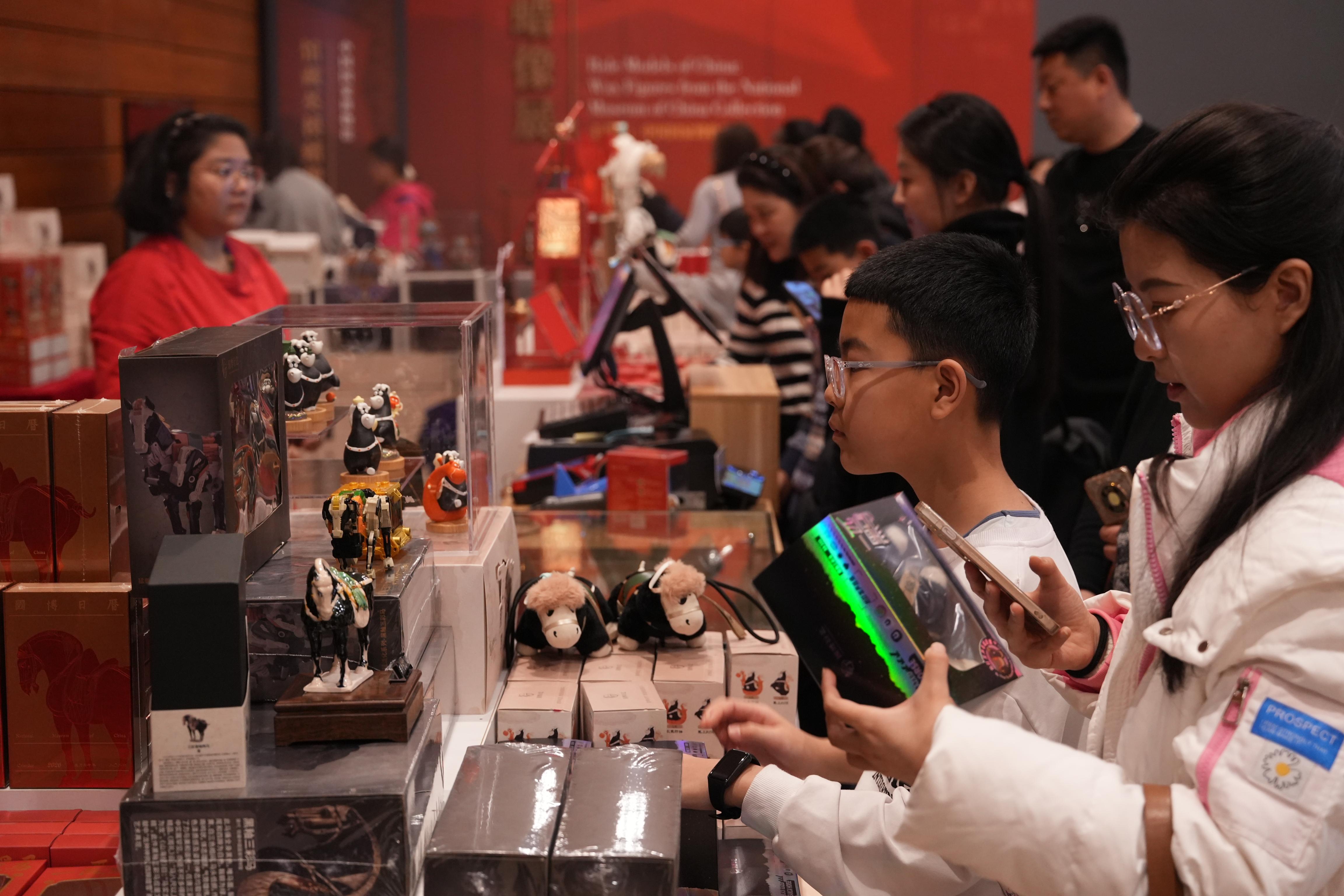 一同展出的还有国博馆藏的三彩黑釉陶马。除了面、鬃、尾、蹄涂白釉,它全身披黑釉,在唐三彩中实属罕见,而且造型雄健,釉色匀称,姿态自然,是唐三彩马中不可多得的精品。围绕该藏品,国博还推出了“一匹黑马”系列马年限定文创产品。