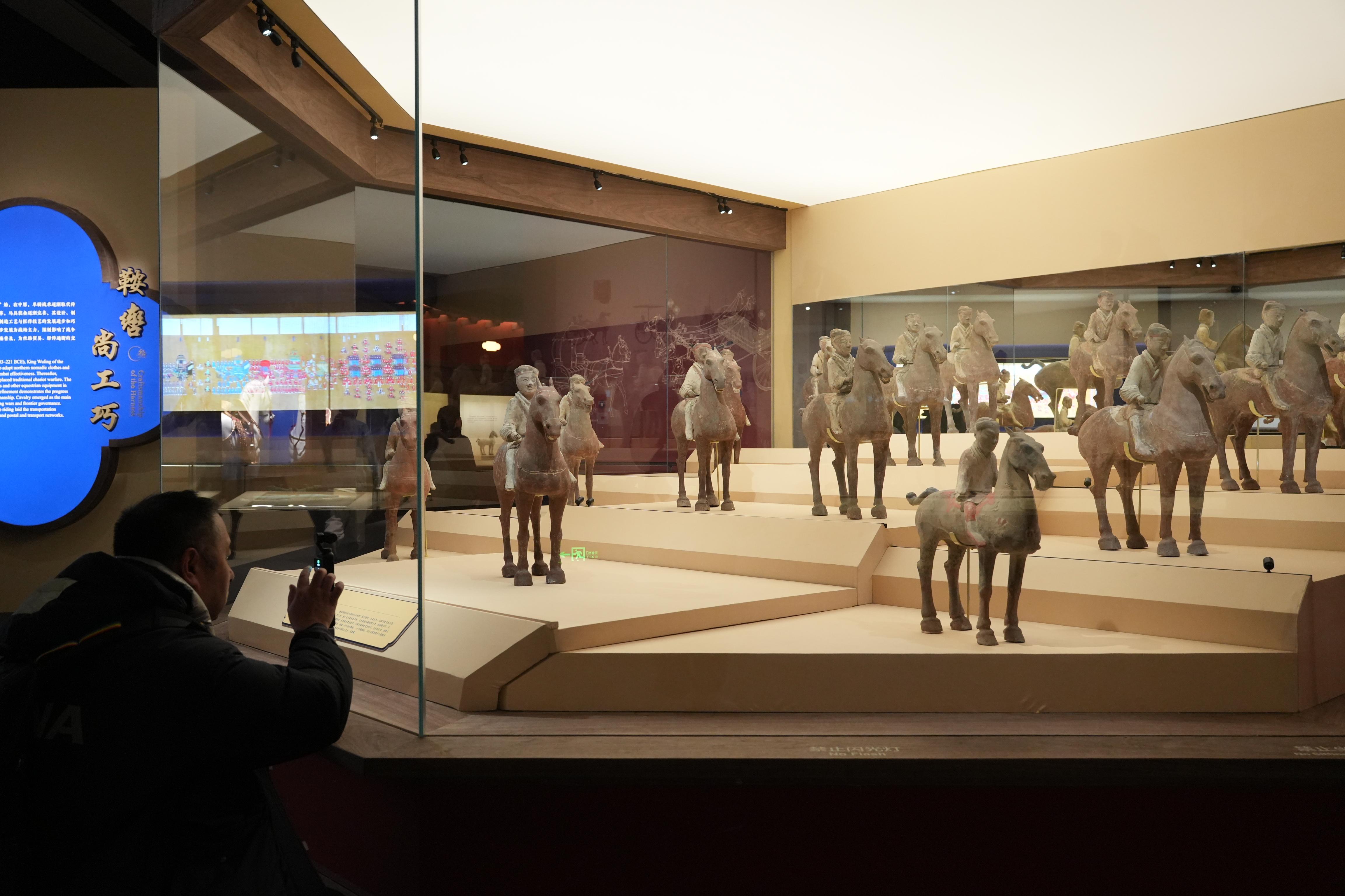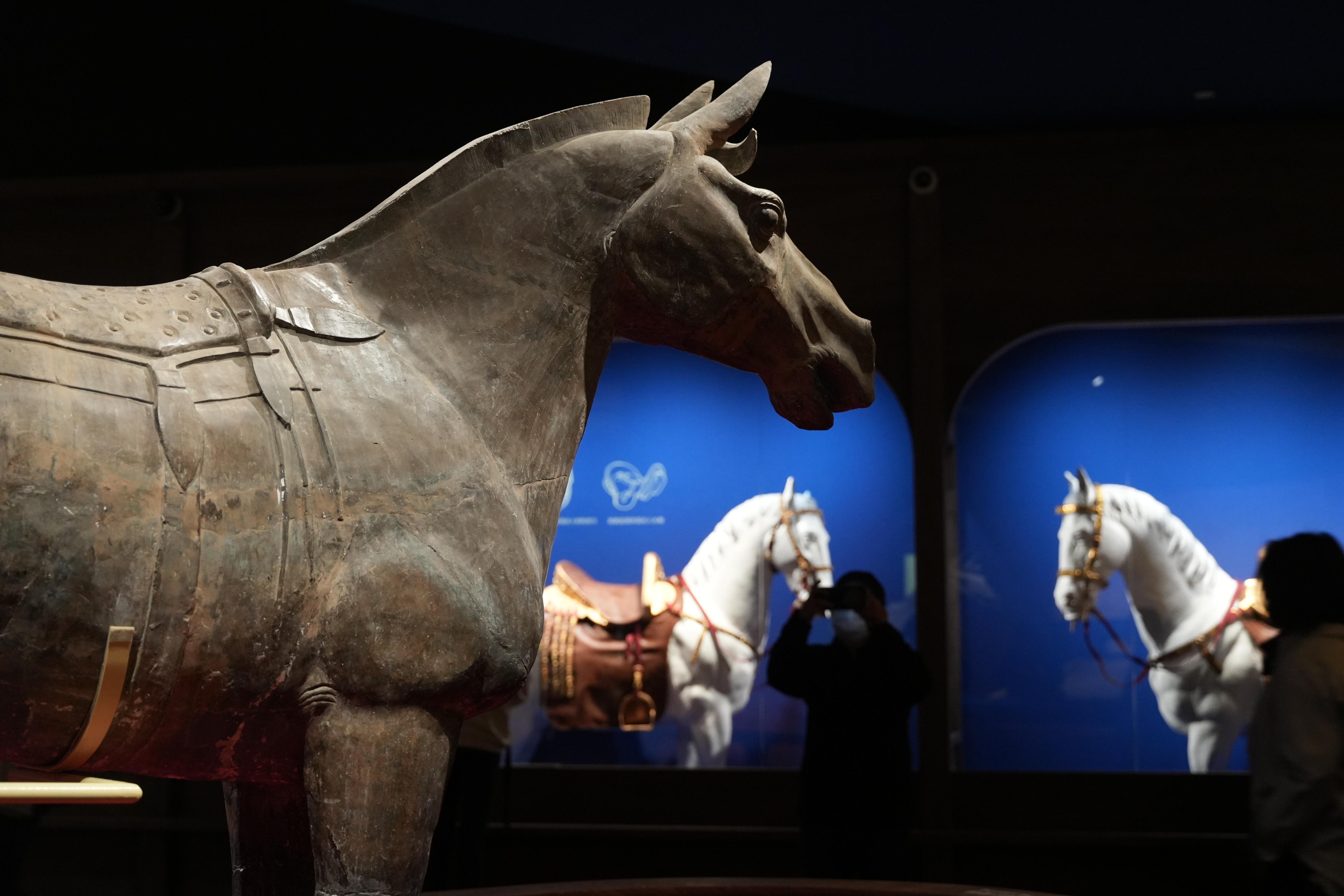 展览展出了来自秦始皇帝陵博物院的鞍马俑。鞍马是骑兵的坐骑,四蹄矗立,劲健有力,两耳如削竹,耳前有鬃花,尾巴成辫形,马背上皆有鞍鞯。鞍马俑塑造了秦代战马健壮有力的形象,反映了秦代筛选战马的标准严格。