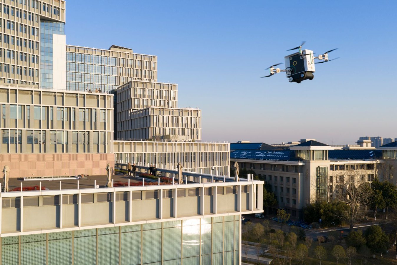 “嗡嗡嗡……”1月23日下午,空中传来一阵螺旋桨搅动空气的声音,一辆飞行汽车穿过东南大学九龙湖校区的粼粼湖面,稳稳降落在湖畔一栋楼的户外平台。