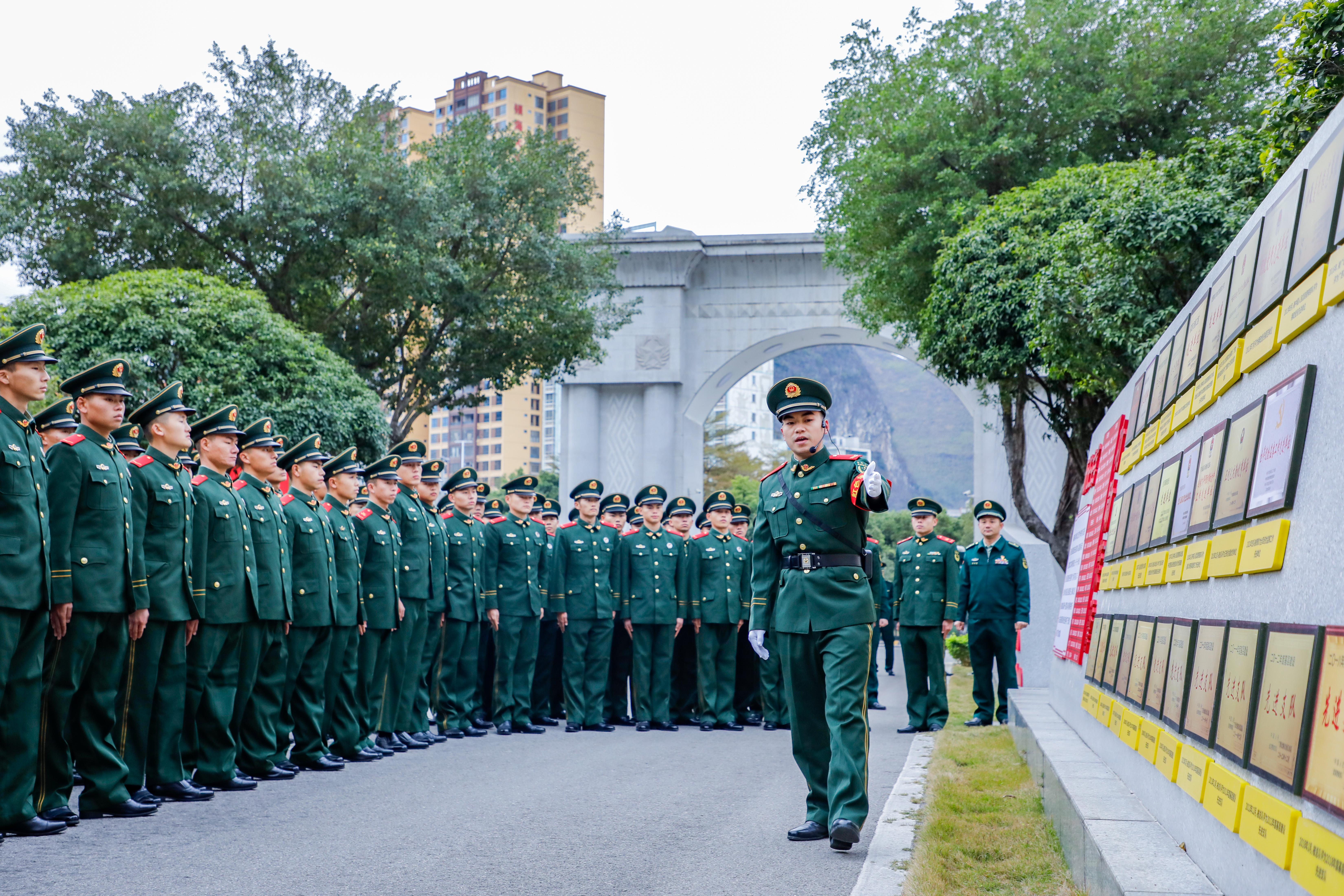 站在“中国武警忠诚卫士”“瑶乡爱民模范”陈卓伟烈士雕像前,聆听着他生前的动人故事,新兵们无不被那舍己救人、献身瑶乡的革命精神和英雄事迹深深感染。全体新兵神情庄重,右拳高举,面对着武警部队旗庄严宣誓,声音激昂洪亮,充分展现出他们将“人民武警为人民”的情怀融入红色血脉的忠诚与决心。