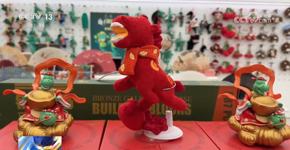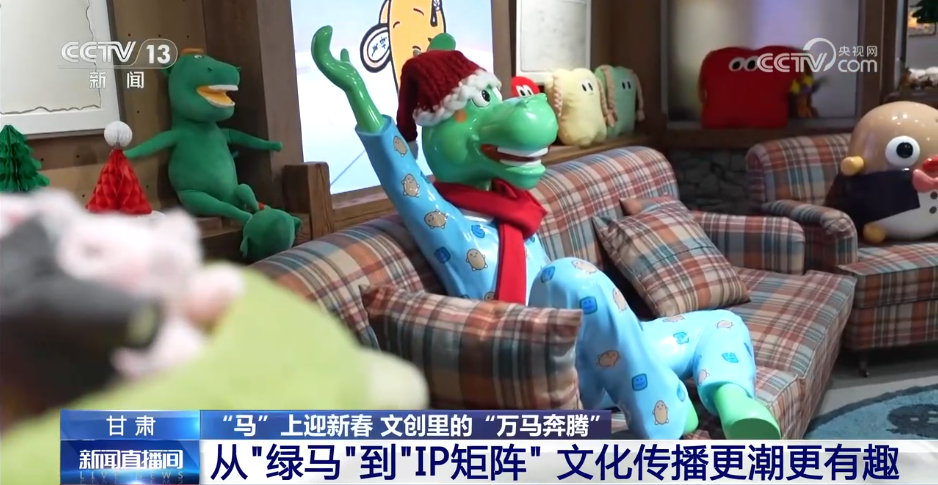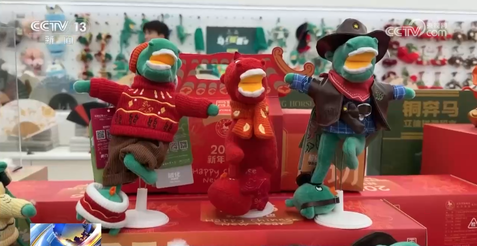 总台记者 王妍:它就是铜奔马的绒化文创——“绿马”,因“丑萌”而出圈。今年是马年,它也拥有了限定版的新春皮肤。你看,通体正红的“红运当头马”、身穿红色针织毛衣的“本命年马”,它们都是甘博今年“马力全开”系列贺岁新品。有没有哪一只戳中你的心啊?
