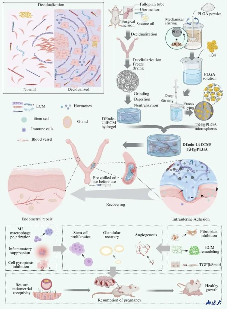 面对这一医学难题,解军教授团队历经多年攻关,创新性提出“蜕膜化赋能”微环境重塑策略。团队成员、山西医科大学梁宇翔博士介绍,该方案跳出传统“被动修补”的治疗局限,聚焦子宫内膜功能层再生的核心生物学机制,通过精准调控免疫稳态、逆转组织纤维化等关键路径,激活体内内源性干细胞的增殖分化潜能,实现子宫内膜功能层的生理性重建。