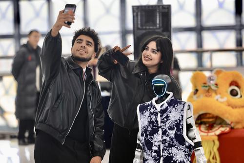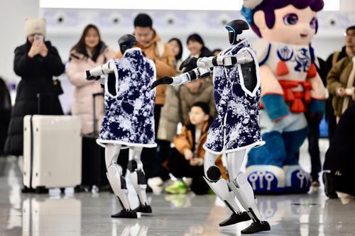 动感音乐响起,舞台下方两台身着青花瓷纹样服饰的人形机器人便成为全场焦点。车站青年职工组成的舞蹈队与机器人互动共舞、配合默契,引得围观旅客纷纷拿起手机录制视频。