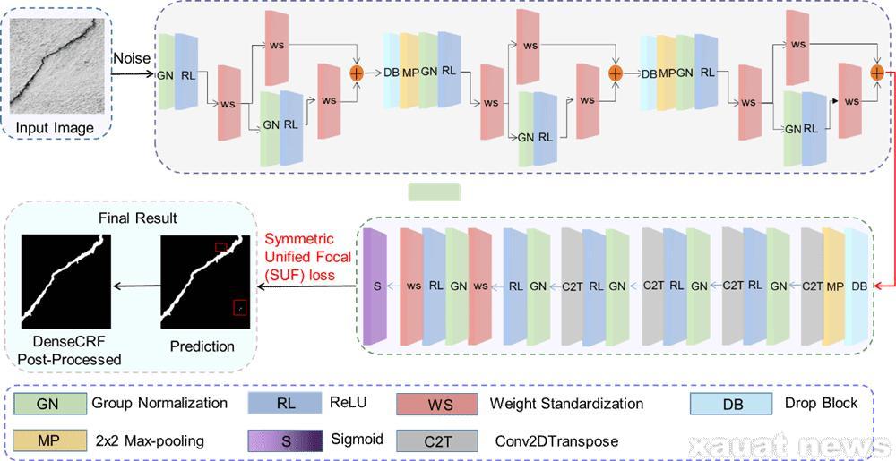 该校周海俊教授团队构建了统一的CrackSeg-GWD裂缝分割框架,通过组归一化、权重标准化卷积等技术,在保证识别精度的同时大幅压缩模型规模。该模型参数量仅0.414M(约41万个),计算量0.849GFLOPs(十亿次浮点运算),常用来衡量模型一次前向推理所需的计算量。具有优异的轻量化特性,更适应工程现场部署需求。