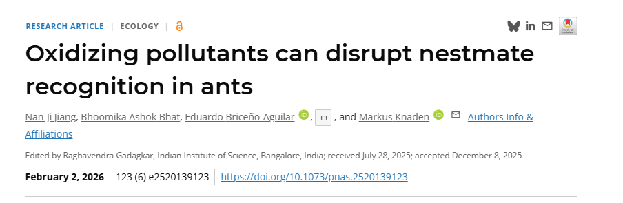 “本研究表明,即使臭氧浓度轻微升高,也足以削弱蚂蚁的巢友识别能力,并对其社会系统造成严重影响。”江南纪表示,同时,这一发现提示,空气污染的生态风险可能不仅体现在个体生理损伤上,还可能通过破坏物种间和种群内部的交流网络,放大其对生态系统稳定性的长期影响。