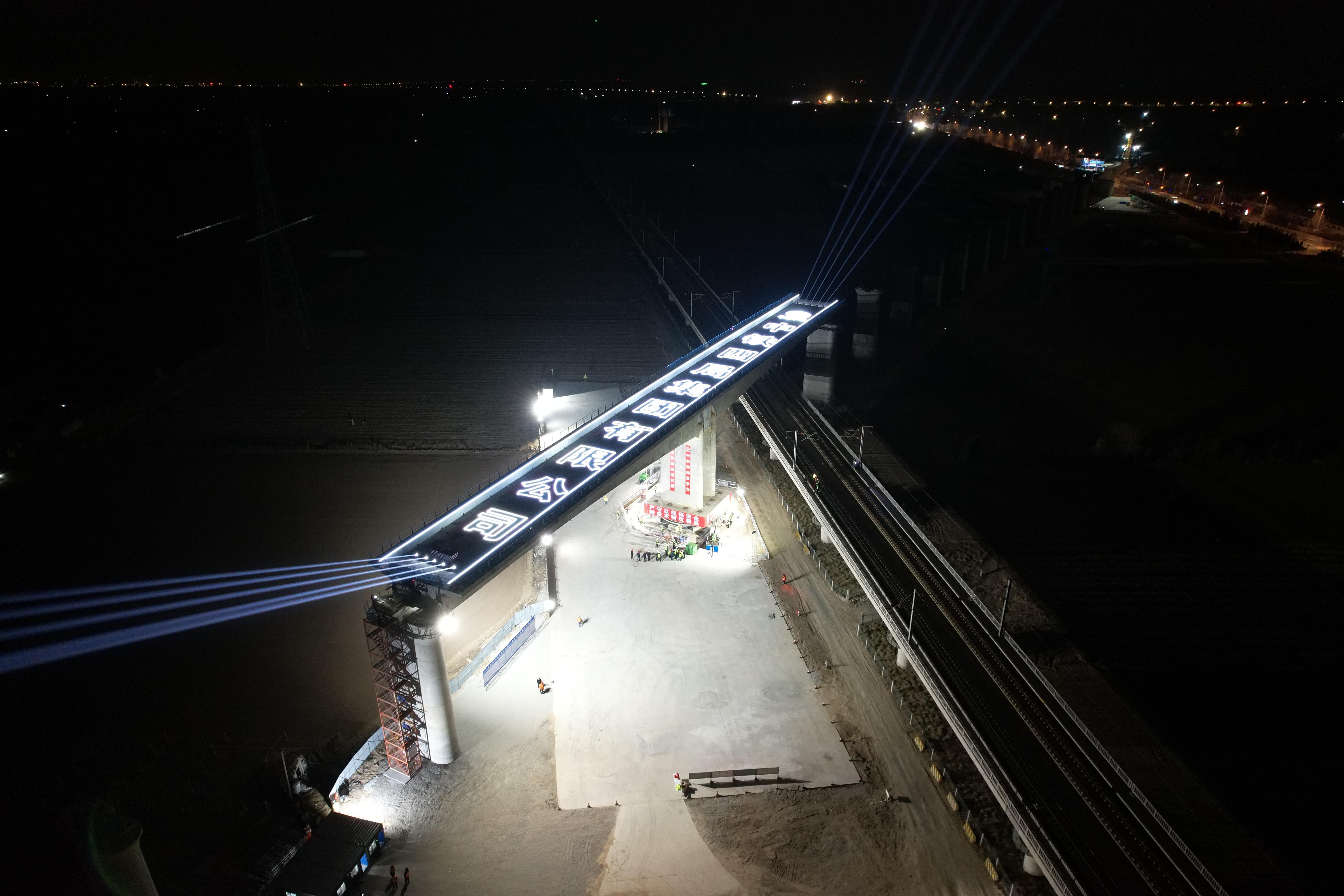 此次施工的潍宿高铁潍坊特大桥转体梁工程位于潍坊市寒亭区,上跨运营中的潍荣高铁,梁体全长129.7米,转体总重达8400多吨,转体前采用悬臂浇筑法施工工艺,顺时针水平转体至设计桥位,转体角度达37度。施工中需严格规避既有线运营风险,核心转体工序利用夜间“天窗点”完成,梁体最远端距既有线路接触网安全距离仅2.9米,安全管控难度极大。
