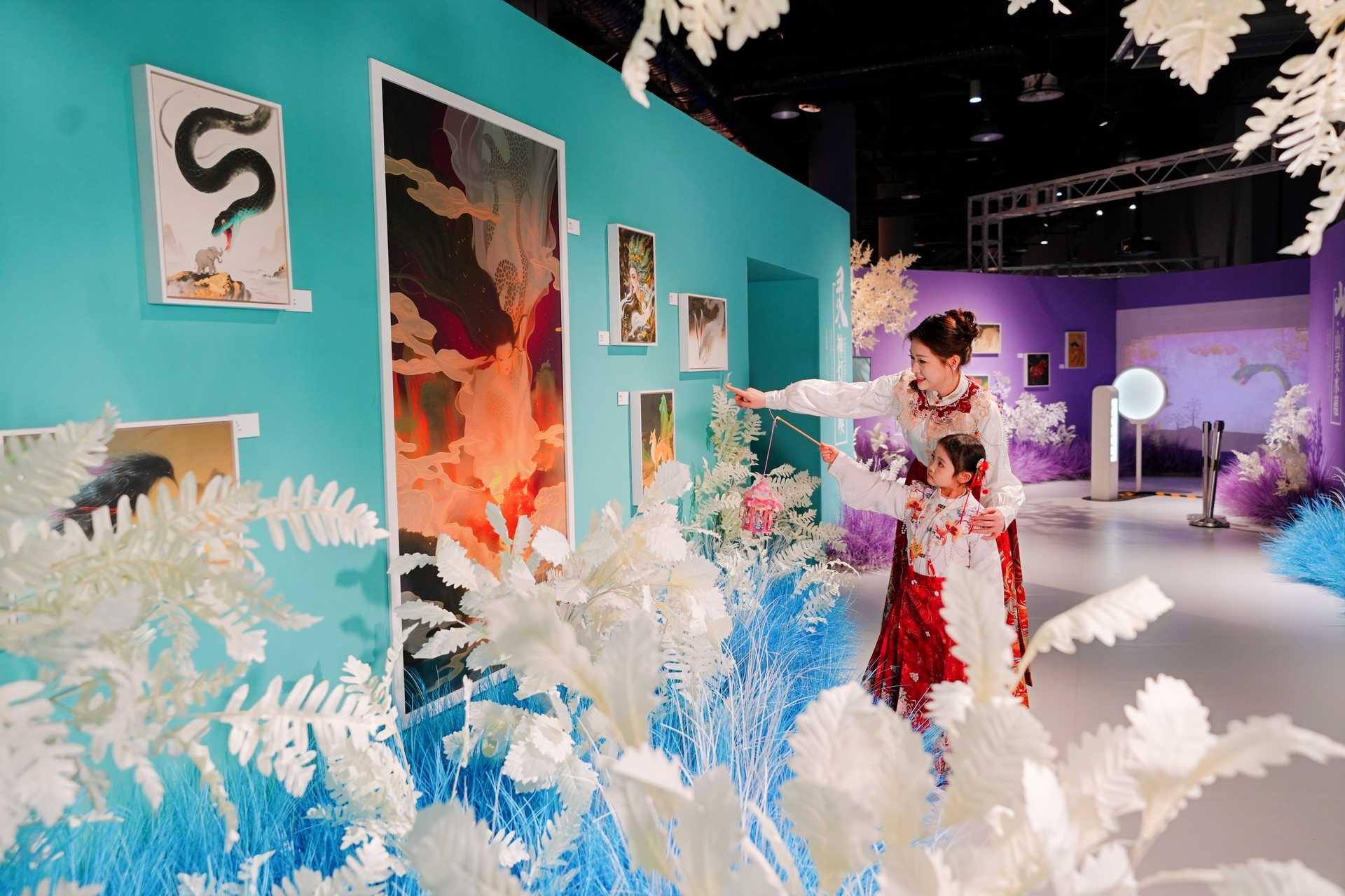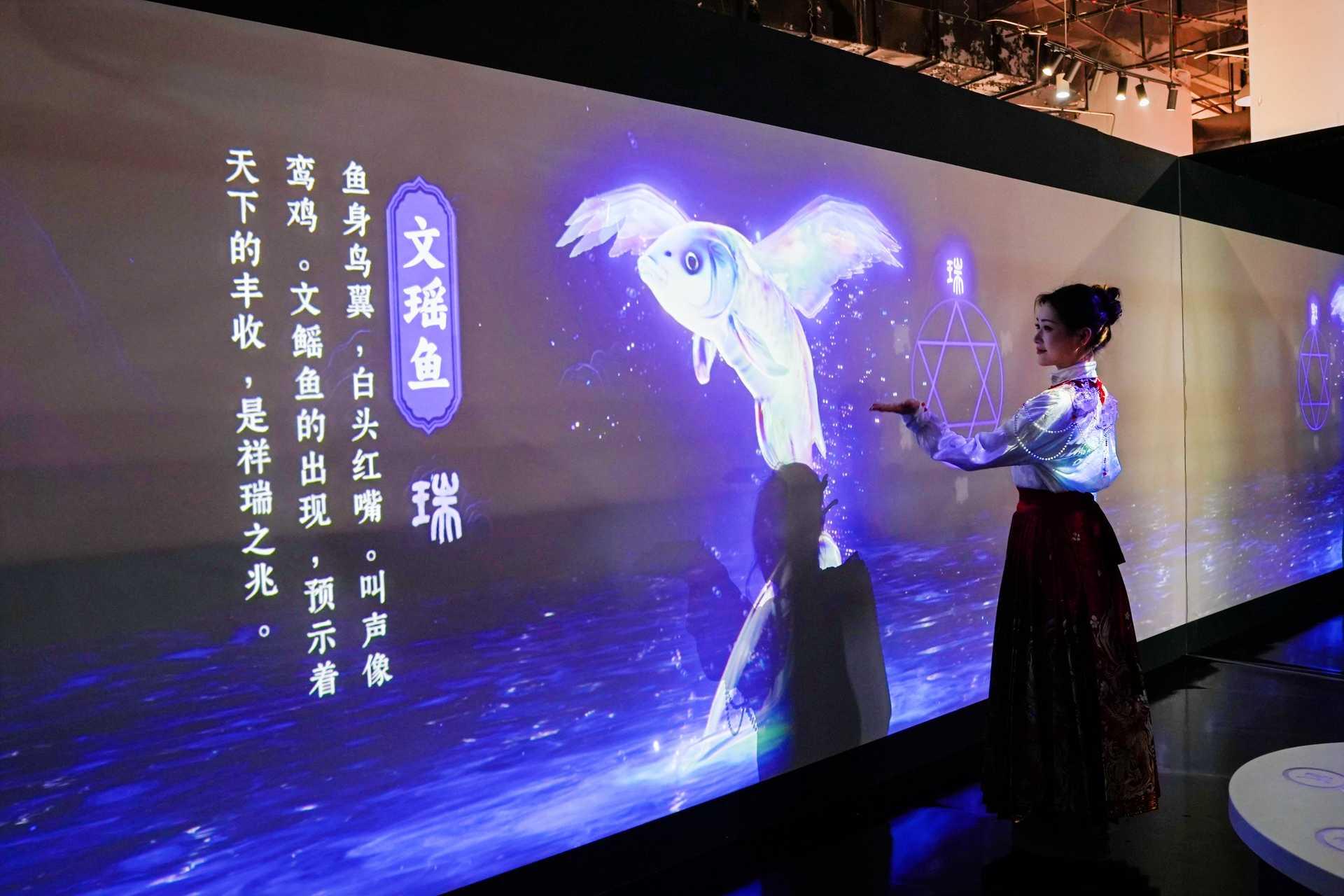在神隐森林展区通过超大绝美造景,还原神灵异兽的隐匿世界,观众可体验汉服换装,一秒穿越洪荒,与灵兽共舞。十余位知名AIGC数字艺术大咖以AI技术复活神兽,14米超长《山海百灵图》山海经画卷首次亮相,呈现视觉震撼。