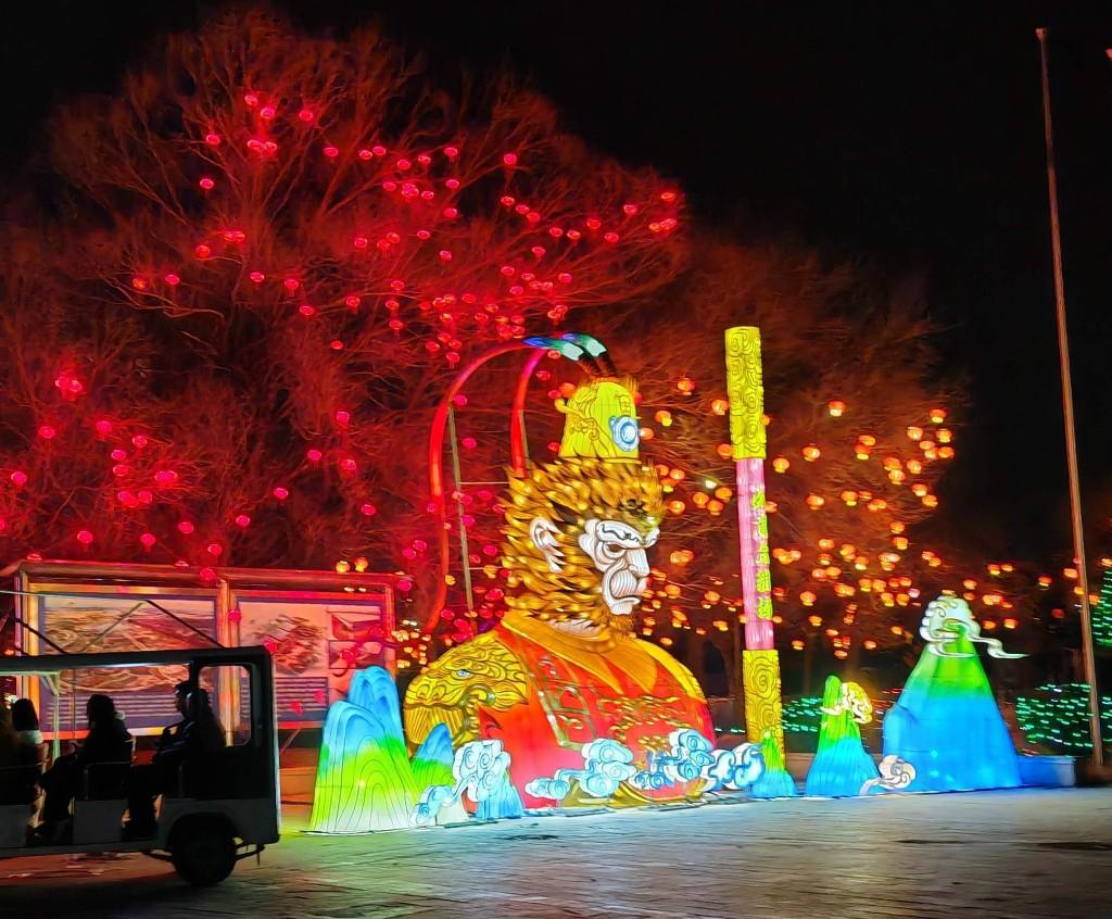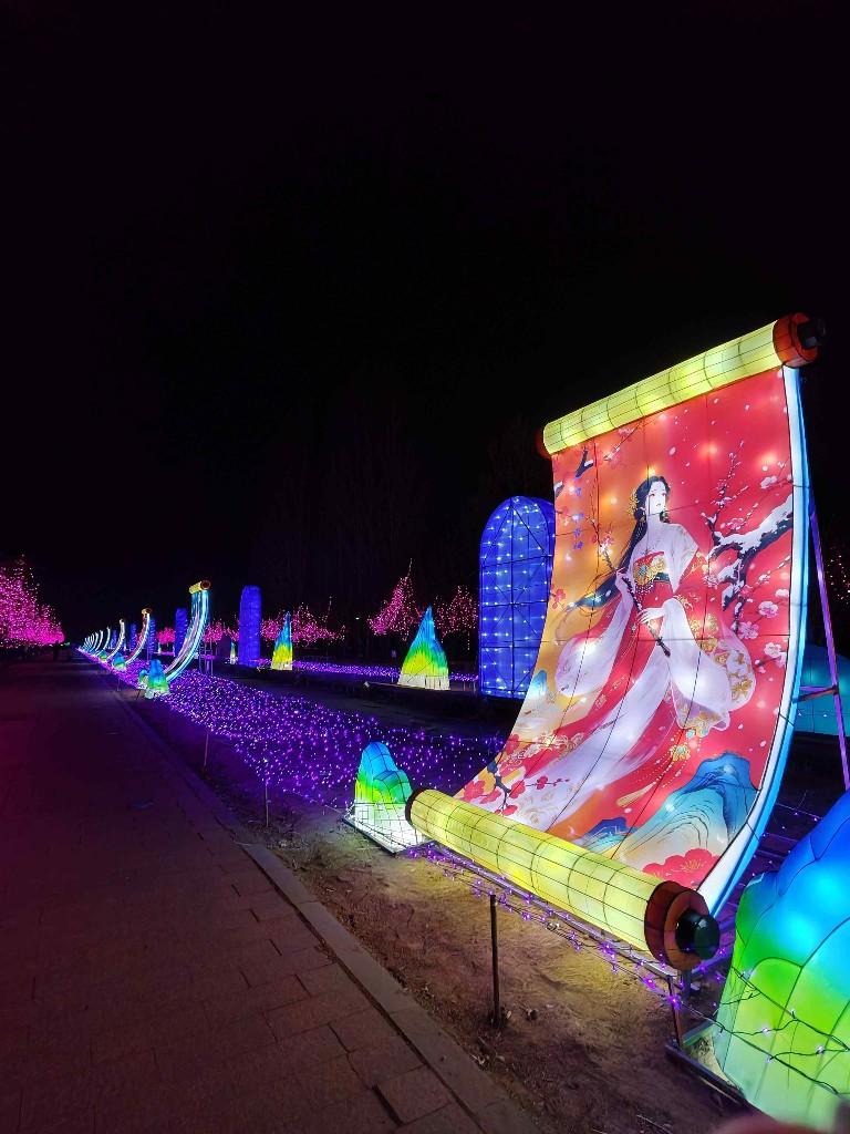 本届灯展规模与内涵双升级,布设超大型主题灯组10组、特色造型灯组30余组、彩灯8000余盏。“十二花神卷轴”“顺义八景”融合传统意象与本土文脉,“百米长龙”“黑神话悟空”“顺义八骏”兼具民俗寓意与国潮风格,在夜色中形成层次丰富的视觉盛宴。