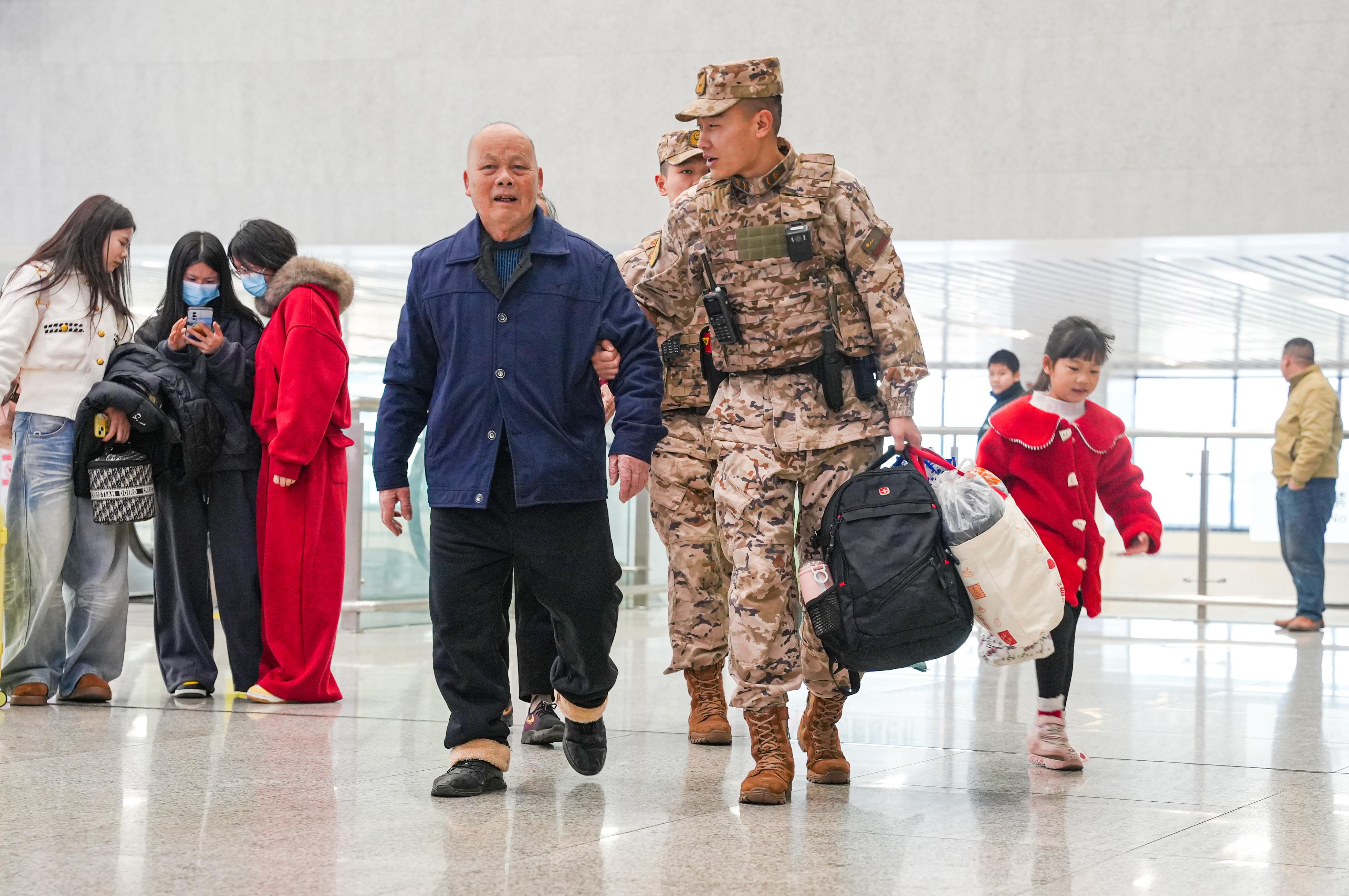 在车站进站口、候车厅等人员密集区域,官兵们全力疏导客流、维护现场秩序,还主动为旅客提供路线指引、协助搬运行李等暖心便民服务,筑牢春运安全屏障,全力为旅客平安出行保驾护航。