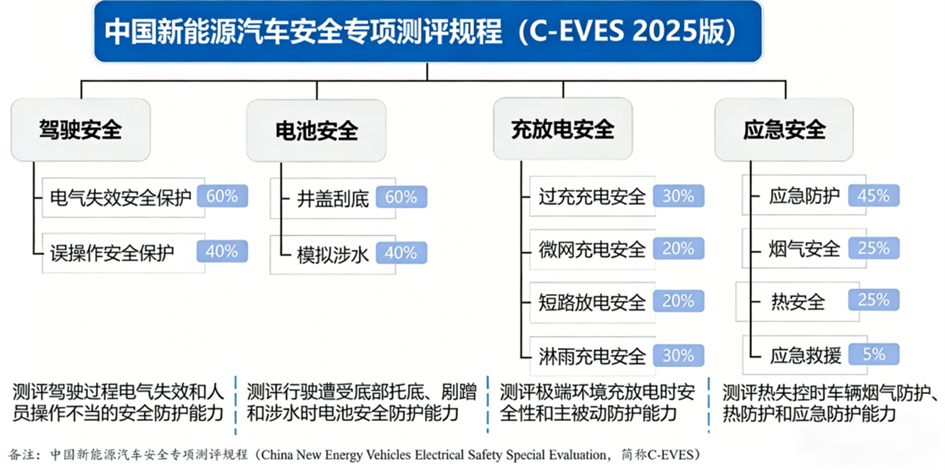 “此次摸底研究使用中国新能源汽车安全专项测评规程(C-EVES 2025版),聚焦驾驶安全、电池安全、充放电安全、应急安全四大维度,对新能源汽车的安全性能进行全面考核。”赵志伟介绍,测评指标覆盖驾驶过程中电气失效和人员操作不当时的安全防护能力;行驶遭受底部托底、剐蹭和涉水时电池的安全防护能力;极端环境充放电时的安全性和主被动防护能力;自燃时车辆的烟气防护、热防护和应急防护能力等。