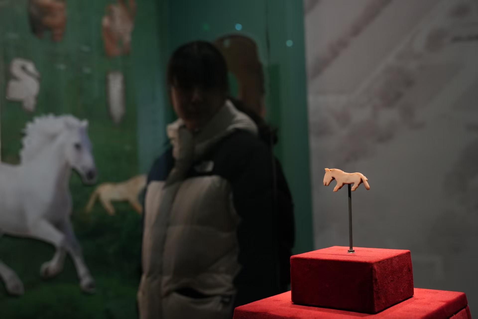 一匹小巧的玉马是本次展览的“明星展品”。它出土自商代妇好墓。妇好墓中共出玉马两件,这是国内目前所知最早的马形象。玉马玉质温润,造型古拙生动,是商代玉雕动物中的典型代表,亦是连接远古信仰与历史现实的珍贵实物见证。