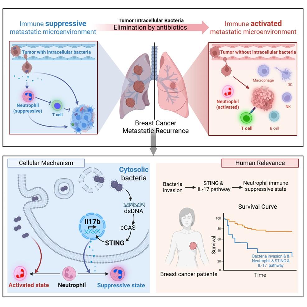 进一步研究发现,胞内菌与胞外菌对免疫的调控作用截然不同:两者均会诱导中性粒细胞富集,但胞内菌将其“策反”为免疫抑制型细胞,胞外菌则使其成为“抗癌战士”。从具体调控机制来看,活的胞内菌会激活肿瘤细胞的特定信号通路,诱导肿瘤细胞分泌IL-17B,这一“策反信号”使中性粒细胞进入抑制状态,抑制T细胞功能,促进肿瘤复发;而胞外菌无法激活该信号通路,直接诱导中性粒细胞抗肿瘤。
