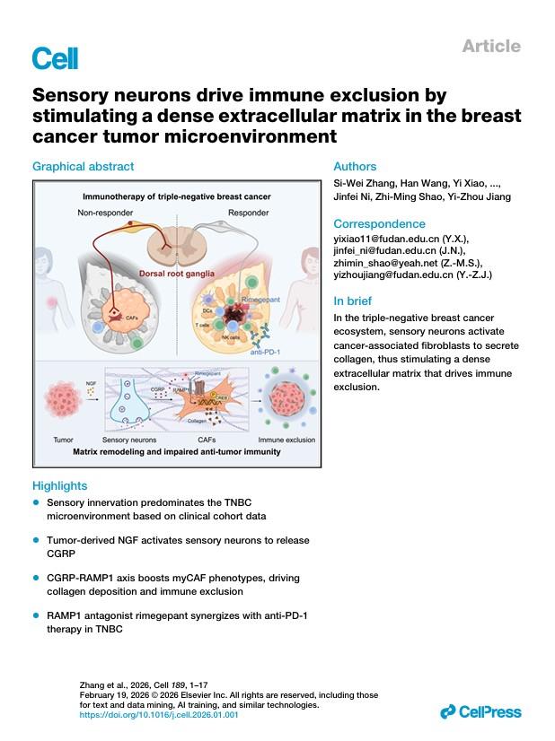 复旦大学附属肿瘤医院教授邵志敏、江一舟领衔的团队,联合复旦大学脑科学转化研究院教授倪金飞团队,揭示肿瘤中的感觉神经是导致部分三阴性乳腺癌患者免疫治疗在短期内耐药的“元凶”,并发现一种用于治疗偏头痛的药物可用于增敏免疫治疗。2月6日,相关研究成果发表于《细胞》。