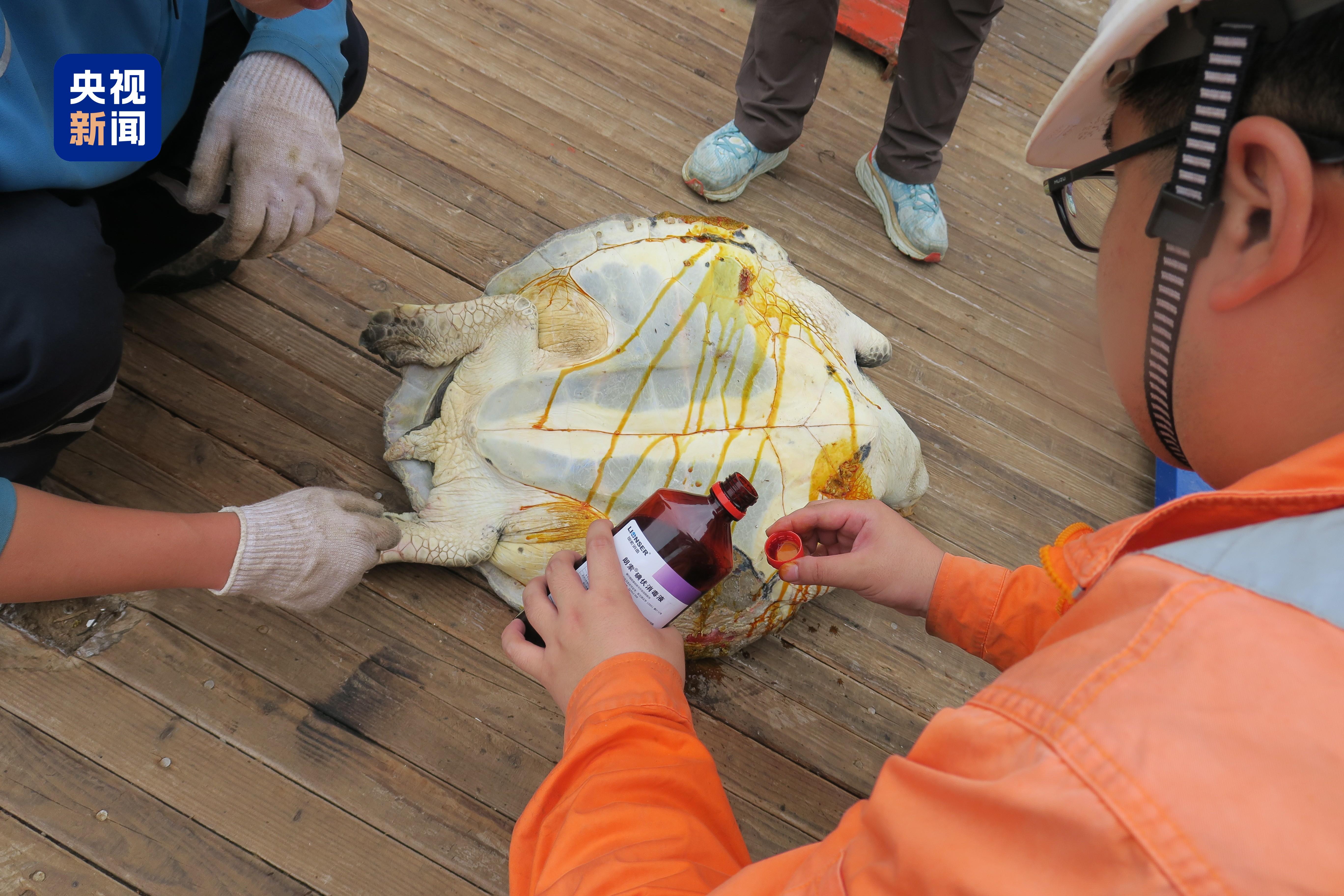 由于长期受渔网缠绕,海龟四肢和龟甲均有不同程度的勒痕和擦伤,伤势较重,好在没有明显骨折迹象,均能自由活动。科考队对海龟伤口进行消毒处理后,将它们放归大海。