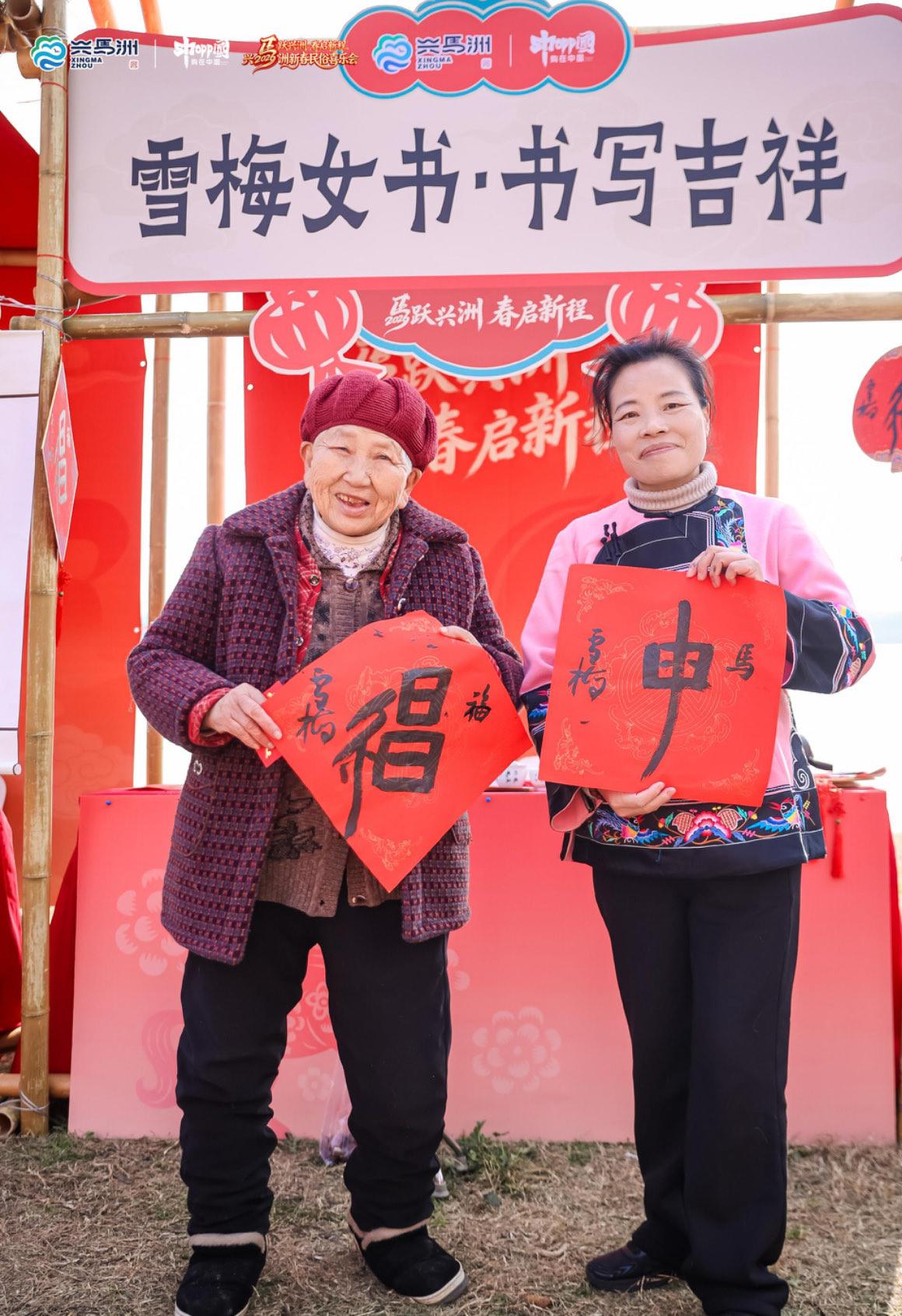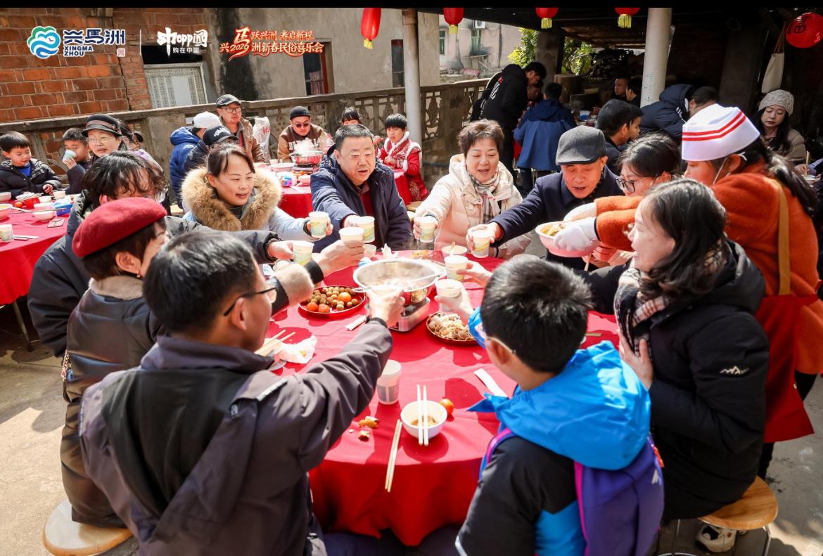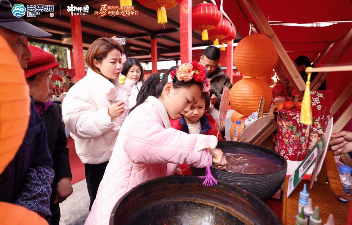 兴马洲主会场,“集五福·跃兴洲”打卡活动吸引了不少市民游客参与。品茶、逛市集、学非遗技艺,每完成一项体验,就能获得一枚特色印章。集齐一套特色印章,市民游客可赢取天心区发放的“新春消费卡”。“兴马好物”展区集合了洲上自产的绿色农产品、独具特色的文创产品,以及40多个民俗摊位。“兴马团圆宴”活动,市民游客围坐一起,品地道家常美味,举杯同庆、共话新春。火红灯笼装点下的兴马洲老村部,还举行了一场暖意浓浓的长寿宴,全村296位60岁以上的老人欢聚一堂,共享新春家宴。