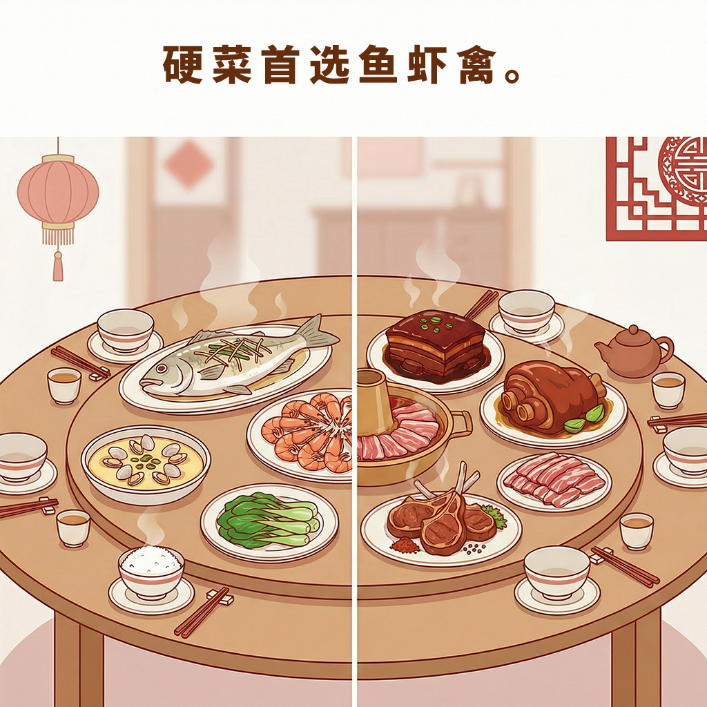 《提示》指出,硬菜首选鱼虾禽。尽管大家日常并不缺“油水”,但春节宴席鸡鸭鱼肉依然是餐桌上的主角。建议优先选择清蒸鱼、白灼虾、水蒸蛋、瘦肉等低脂且优质蛋白丰富的食物,红烧肉、肘子、手抓羊肉、肥牛等较油腻的荤菜最好和清淡少油的蔬菜搭配。蔬菜水果也是主角。春节宴席最容易被“冷落”的是蔬菜和水果。建议餐餐都要有蔬菜,一桌菜品至少要安排三分之一是素菜,菜的选择可以兼顾叶菜、瓜果类和根茎类。水果最好在餐前聊天时吃,不要吃饱了再“填缝”,更不要用果汁或果味饮料代替新鲜水果。