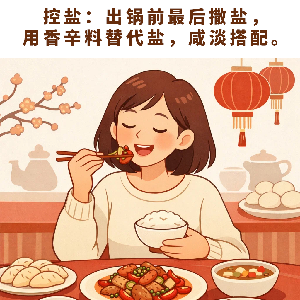 《提示》建议,春节宴席,适当控制盐油糖。控盐方面,一是炒菜出锅前撒盐或鸡精、蚝油等,这样可以让盐留在菜品表面,能更好地被舌头感受到。二是多用辣椒、胡椒、花椒、葱姜蒜等香辛料,它们会刺激味蕾产生更强的咸味感受。三是咸淡搭配,安排几个清淡少盐甚至不加盐的菜作为平衡。