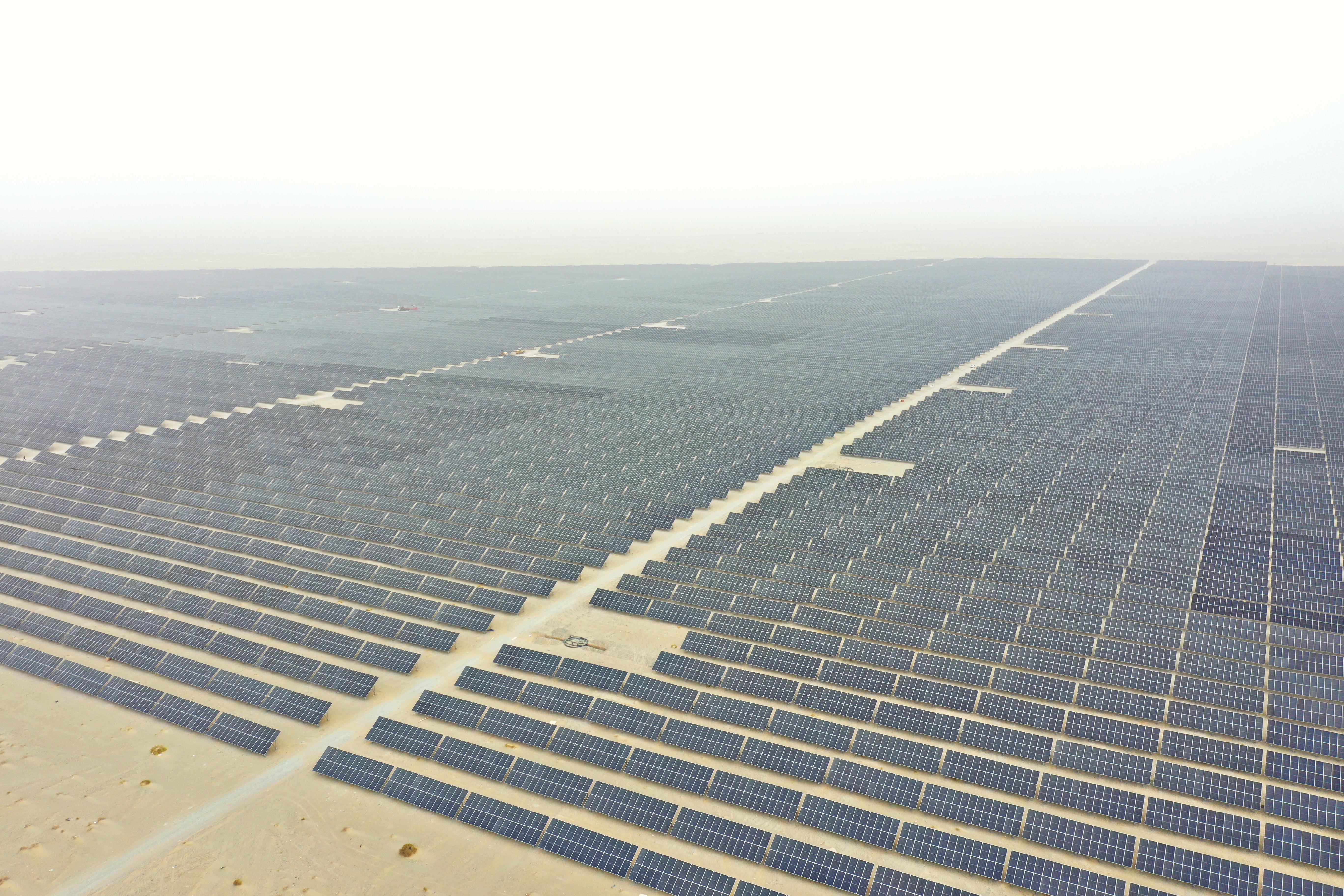 沙漠深处,数以万计的光伏板在夕阳余晖中泛着静谧的蓝光,犹如一片蓄势待发的能量之海。不久后,这里输送出的绿色电力,将点亮远方城市的灯火,而板下悄然萌发的新绿,将默默缚住黄沙,守护着这片土地走向更有希望的未来。