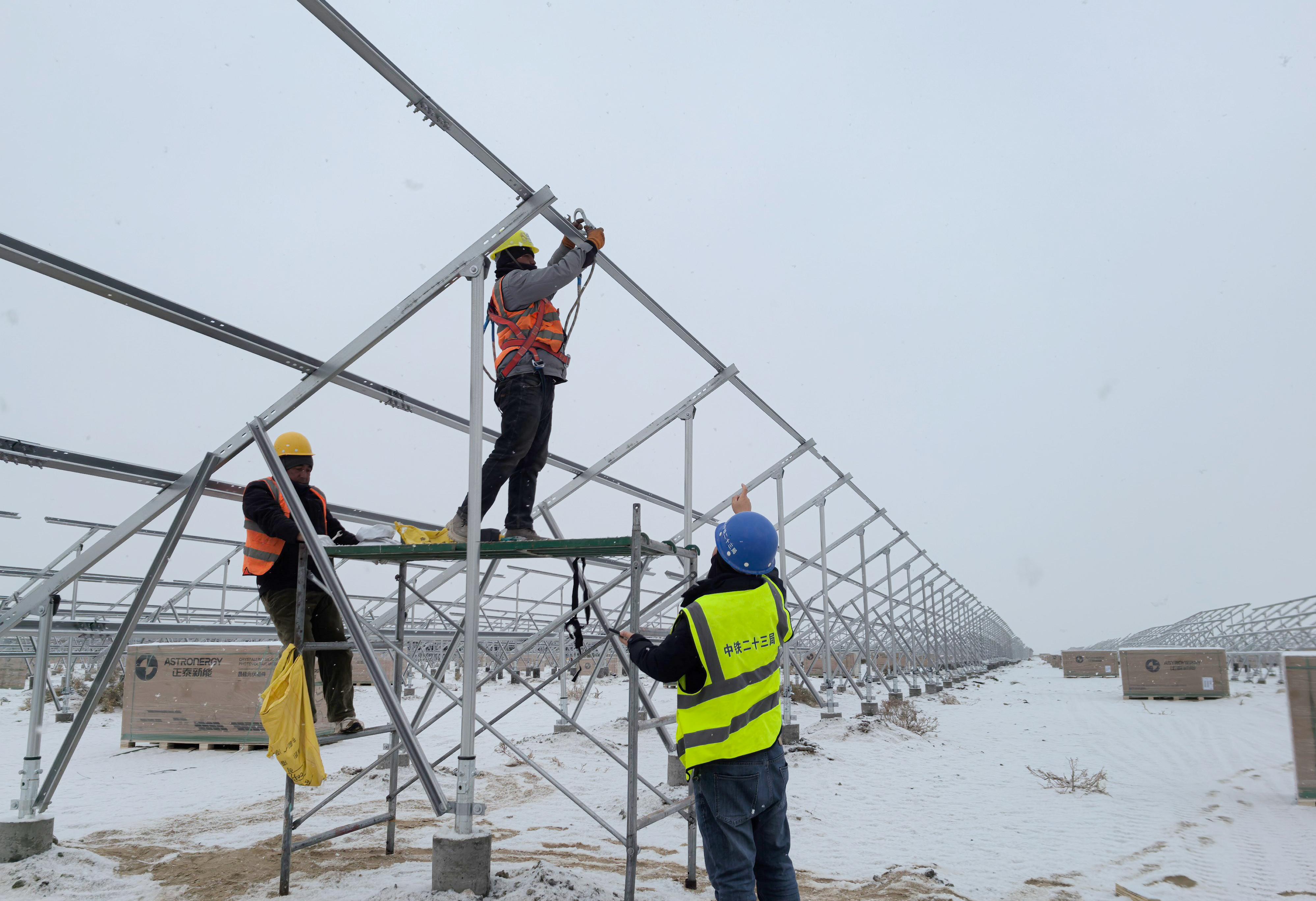 然而,在沙漠中“种太阳”并非易事。项目施工团队自进场以来,就面临着工期紧、气候恶劣的双重考验。“冬季的沙漠,最低气温能降到零下20摄氏度,强风一刮,沙粒打在脸上生疼,给支架拼装和组件安装带来了极大挑战。”项目负责人介绍,光伏组件精密脆弱,低温会影响安装精度,强风则可能导致支架移位,施工团队只能“与天赛跑”,在做好保暖防护的同时,优化施工流程,实行24小时轮班作业。