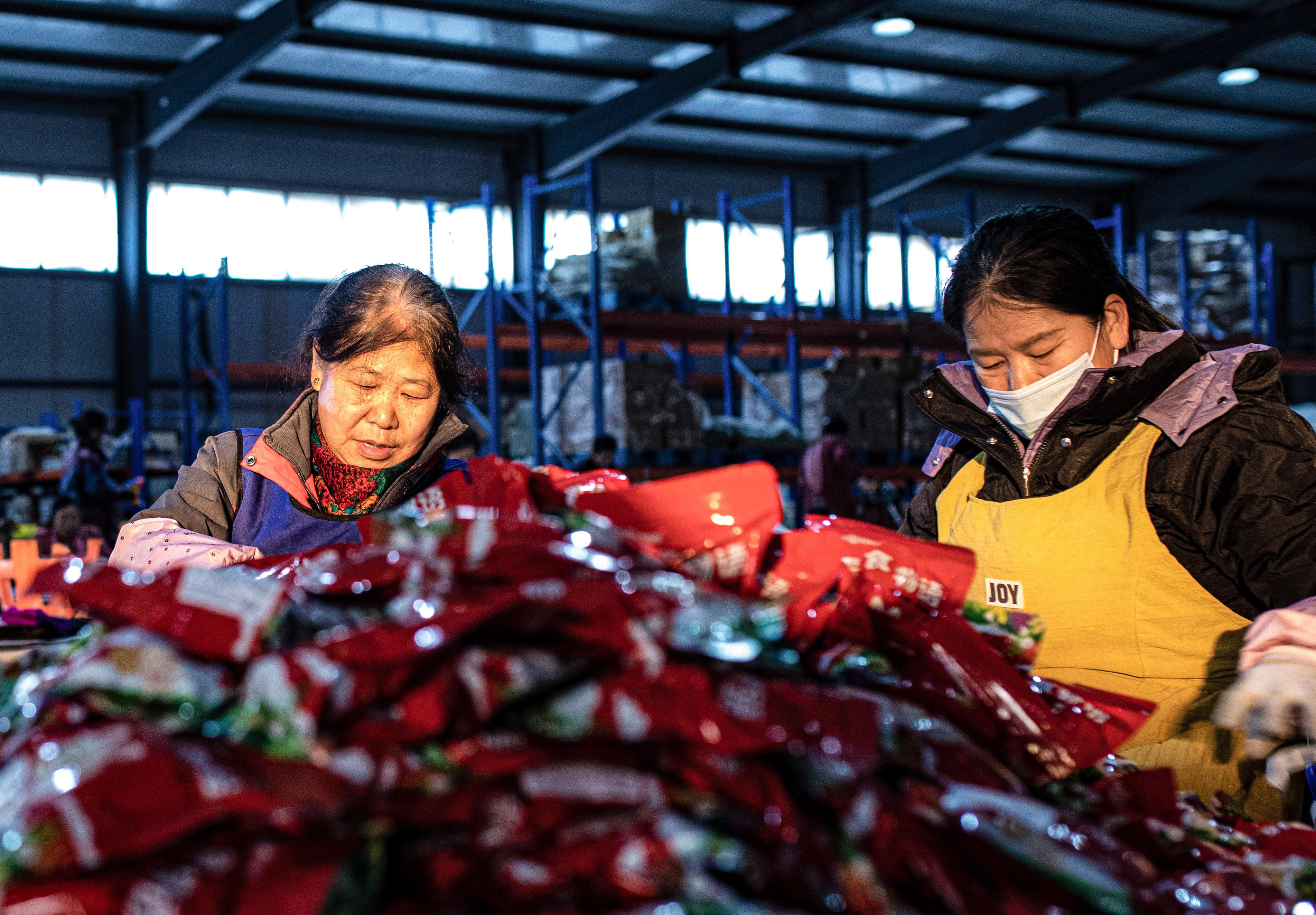 2月11日,小年启岁,年味渐浓。上午九点,在山东省乐陵市杨安镇圆通智慧云仓6号库内,货箱堆积如山,包裹在传送带上飞速穿梭,20余名工人身着工装,手指翻飞间,分拣、打包、贴单三个关键性动作一气呵成。
