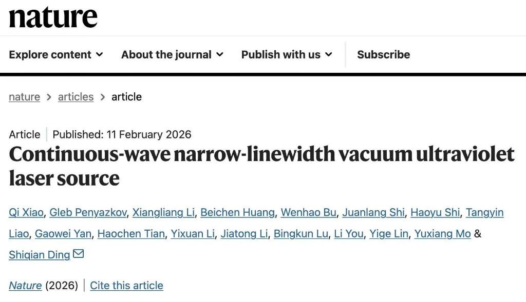 2月12日,清华大学副教授、北京量子信息科学研究院兼聘研究员丁世谦团队,在连续波真空紫外光源方面取得重大突破,成果发表在国际期刊《自然》上。据悉,该团队成功研制出148nm连续波超窄线宽激光光源,首次将超稳激光技术拓展至真空紫外波段,攻克了核光钟研制的“最后一个核心瓶颈”。这一突破补齐了核光钟的关键技术短板,为精密测量领域发展开辟新路径,彰显了我国在量子科技与基础研究领域的领先实力。