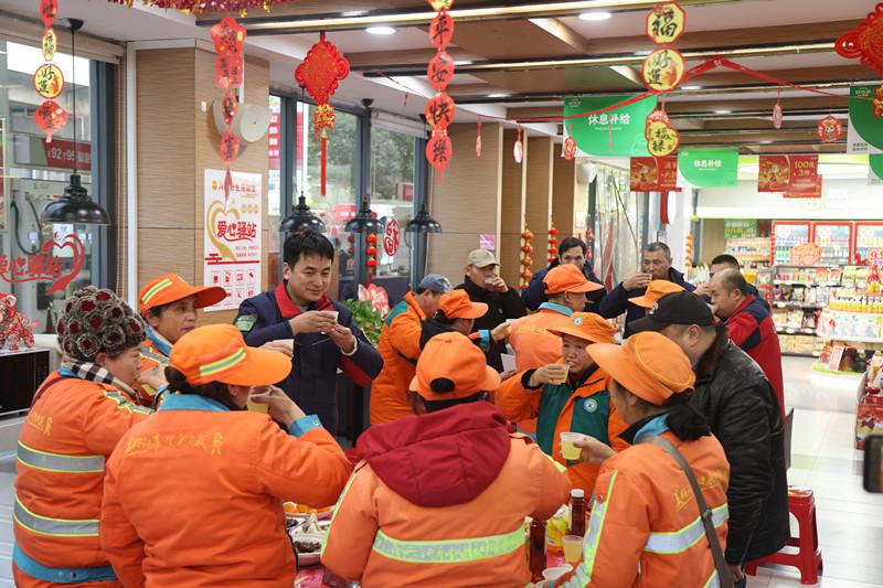 环卫工人李师傅虽然不加油,却是头道街加能站“爱心驿站”的常客。平时清扫街头间隙,他总会来这里喝水、歇脚、给手机充电,感受片刻休憩的温暖。“快过年了,加油的车辆越来越多,他们却始终惦记着我们这些户外劳动者,年年都请我们吃团年饭,这几年的小年夜,我都是在这里过的,就像在自己家一样热闹、暖心。”李师傅说。