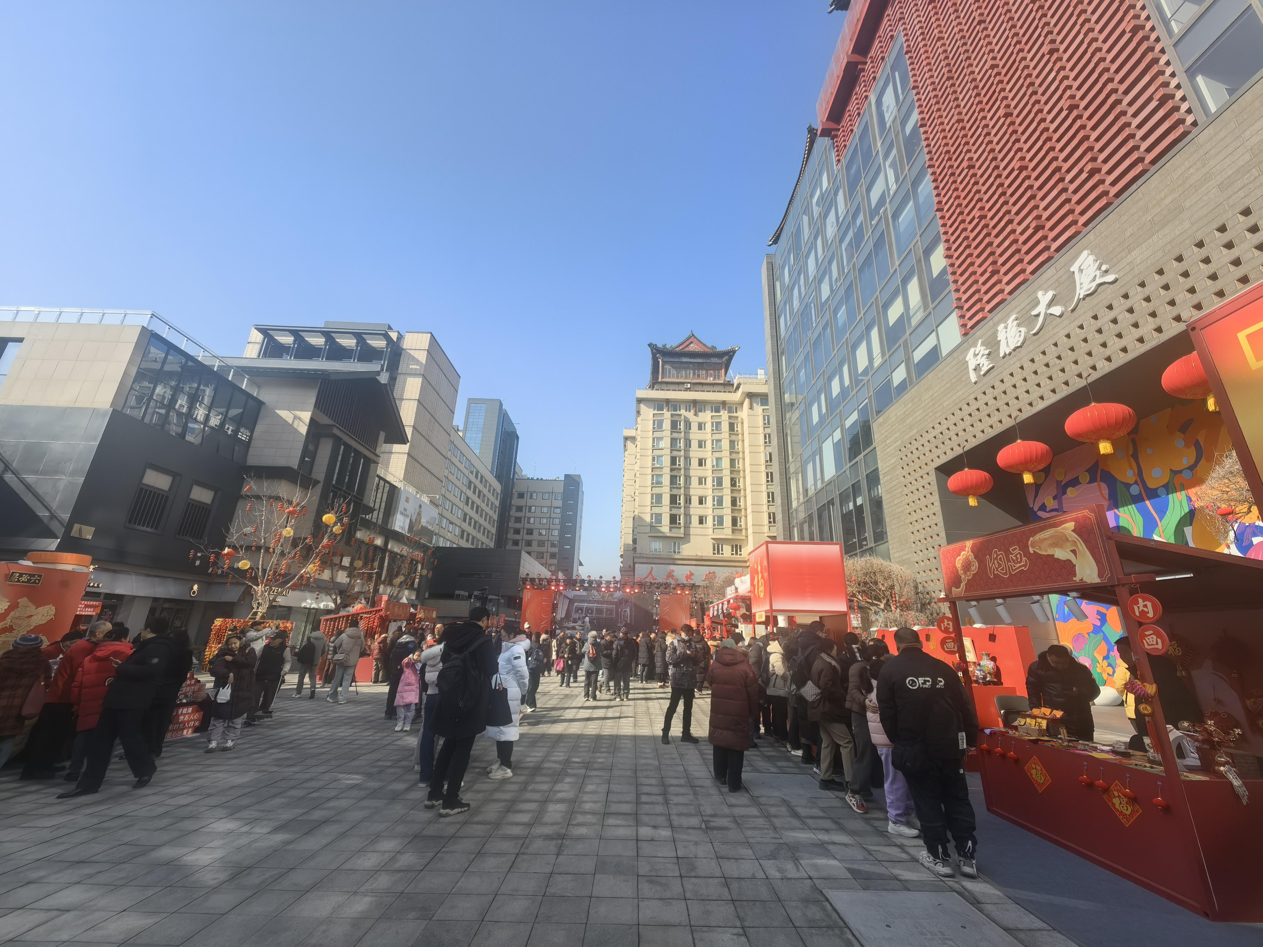 本次市集持续至3月3日,每日10时至19时开放,设置2个演出空间、53个摊位,联动57个品牌,满足市民采购、体验、游玩需求。街区布置“隆福马”雕塑、百盏祈福灯与新春福字装置,营造“步步见福”的喜庆氛围,预计日均接待游客5万人次。