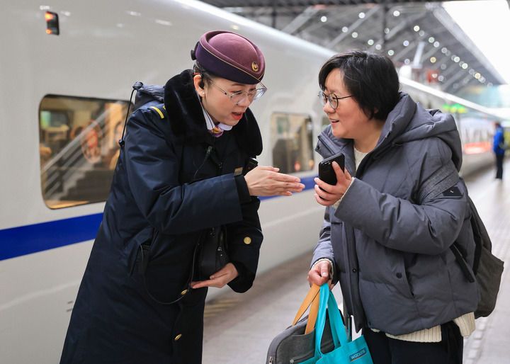 “哈尔滨冰雪大世界”主题高铁在林海雪原中疾驰,从上海返乡的乘客张文奇已归心似箭。“在外打拼一年,一上车看到这些熟悉的冰雪元素,心就到家了。”他接过列车长送上的吉祥物,笑意盈盈。对于像他这样跨越千里归乡的游子来说,奔赴,是春节最深情的序章。