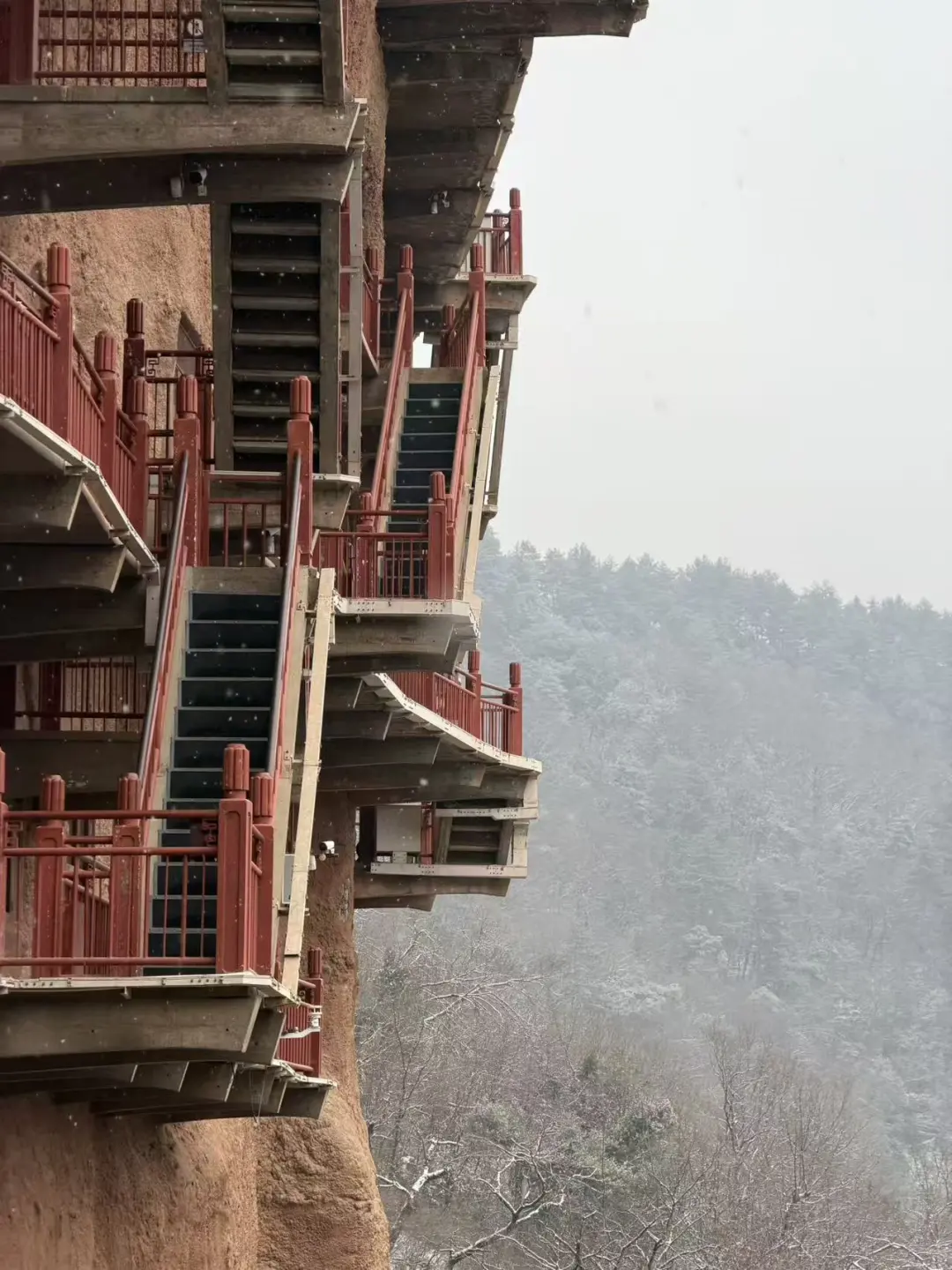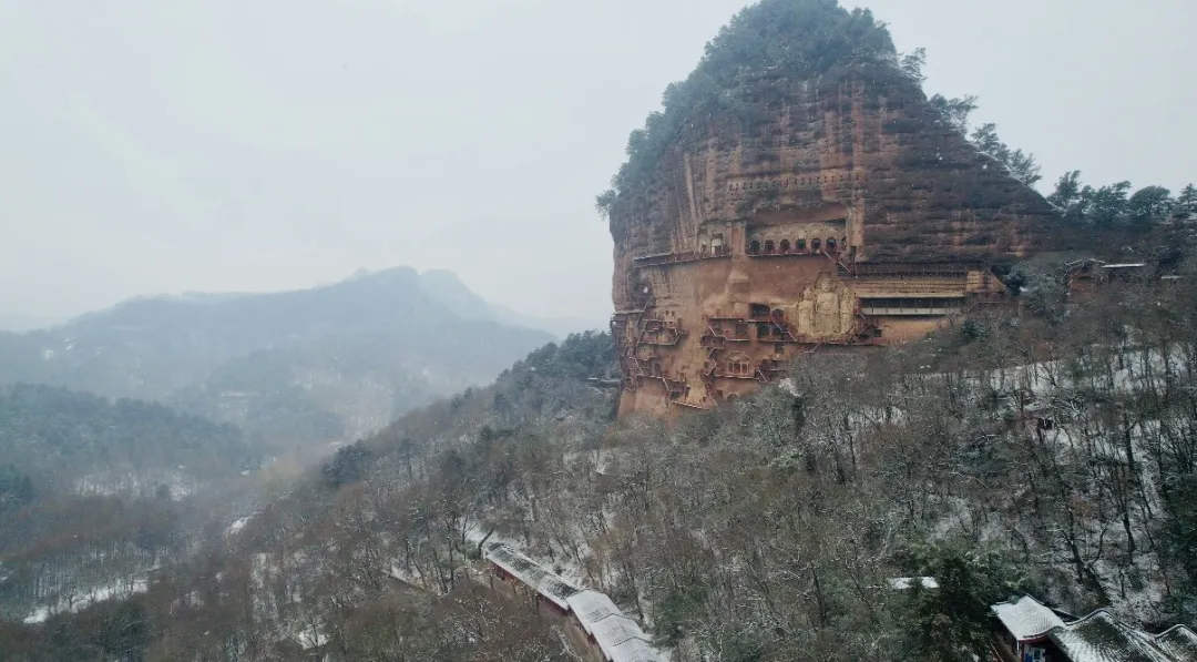 新春前,甘肃天水的麦积山迎来一场雪,秦岭余脉的寒风裹挟着雪花,掠过麦积山石窟的栈道。