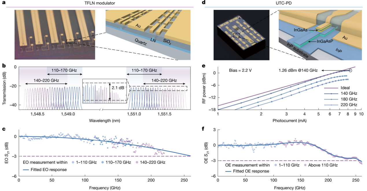 论文通讯作者、北京大学电子学院副院长王兴军教授表示,该成果就像是通信领域的“全能战士”,除实现兼容且超大容量通信外,在能耗、成本、规模化等方面也有卓越的表现。未来可在6G基站、无线数据中心等场景中广泛应用。该成果成功突破三项世界纪录,包括250GHz(千兆赫兹)以上超大带宽的光电/电光转换器件、薄膜铌酸锂调制器和磷化铟探测器带宽。