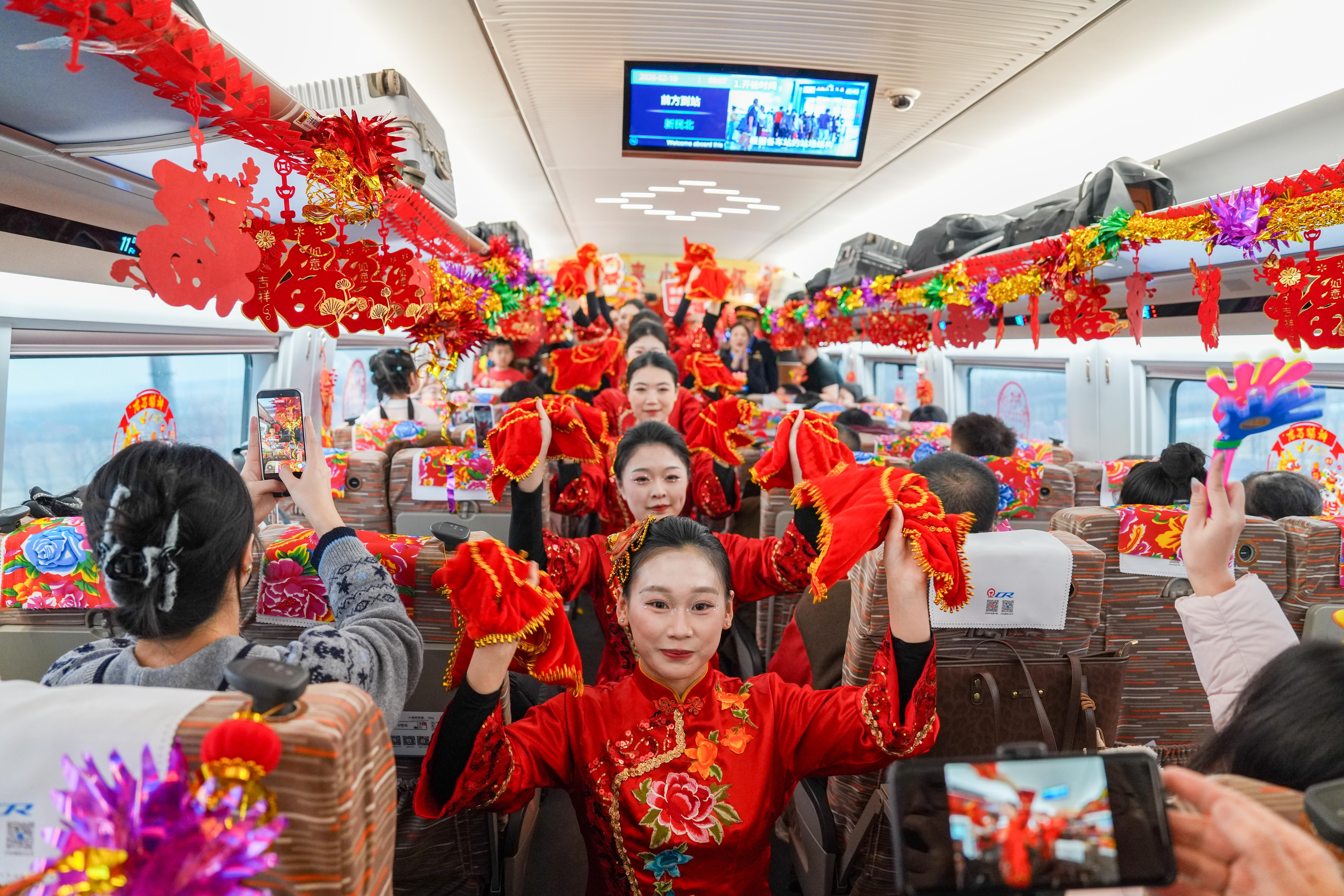 正值春运,G3606次列车从沈阳站驶出,开往北京朝阳站。为了营造年味,车厢经过了精心装扮,马年窗花、福字挂件与东北冻秋梨、灶糖相映成趣。清晨时分,车厢里响起了欢快的旋律,乘务人员身着大花马甲跳起舞蹈,赢得乘客阵阵喝彩。