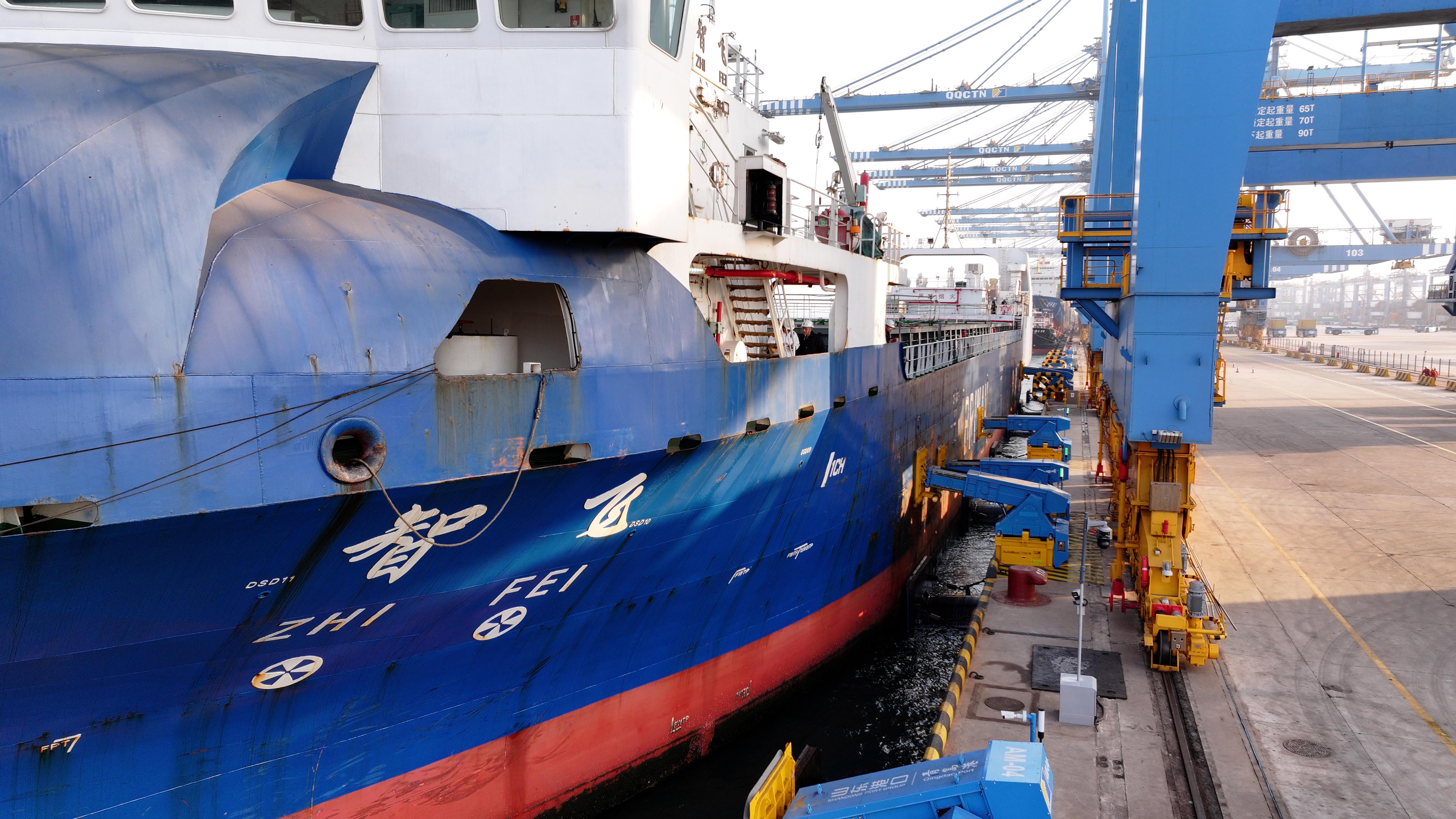 “智飞”号搭载国内自主研发的智能航行核心系统,是世界最早具备自主航行能力的船舶之一,也是国内首艘面向商业运营的智能运输货船,具备人工驾驶、远程遥控、无人自主航行三种模式。此次,“智飞”号采用无人自主航行模式驶入青岛港自动化码头,船舶自动精准规划航行线路,稳稳进入泊位区域。