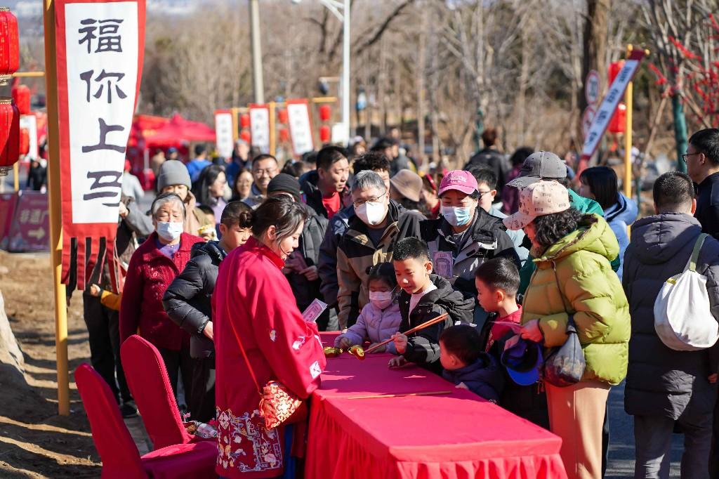 游园会兼顾游玩与消费,现场设置潮趣市集与美食区,开设“海淀好物”专区,集中展示本地优质农产品、西山特色美食及对口支援地区好物。同时推出击鼓祈福、系祈福丝带等互动项目,让游客在山岭间许下新年心愿,把年味与祝福带回家。