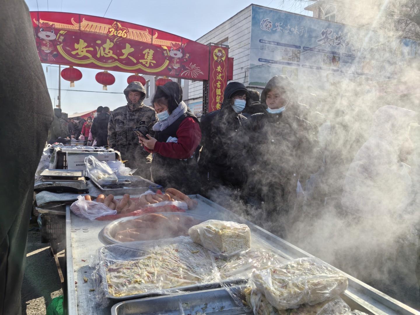 安波温泉资源是大集最亮眼的特色名片,大集现场,包装精美的安波温泉水免费向游客发放,成为最受欢迎的“伴手礼”,让每一位游客都能把安波的温暖与惬意打包带回家。“年货装满了后备箱,这袋水,是装在心窝里的安波。”一位当地摊主笑着说。游客们拎着这袋水,或回家泡脚洗脸,在寒冬腊月里,让来自地心的余温延续旅途的惬意。这不仅是资源的分享,更是安波人“把温暖送给远客”的情谊。