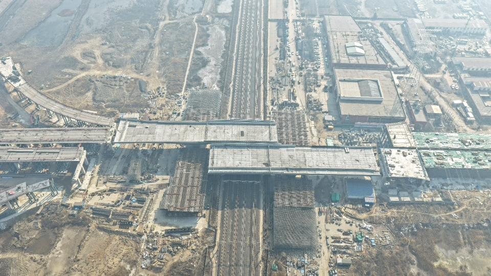 该工程位于唐山市曹妃甸区,全长1685米,西起滨海大道,向东跨越青林公路、唐曹及迁曹铁路等多条交通干线。“工程上跨四条电气化铁路,施工环境复杂、技术标准严苛,是区域交通重点项目。”项目负责人李旭介绍。