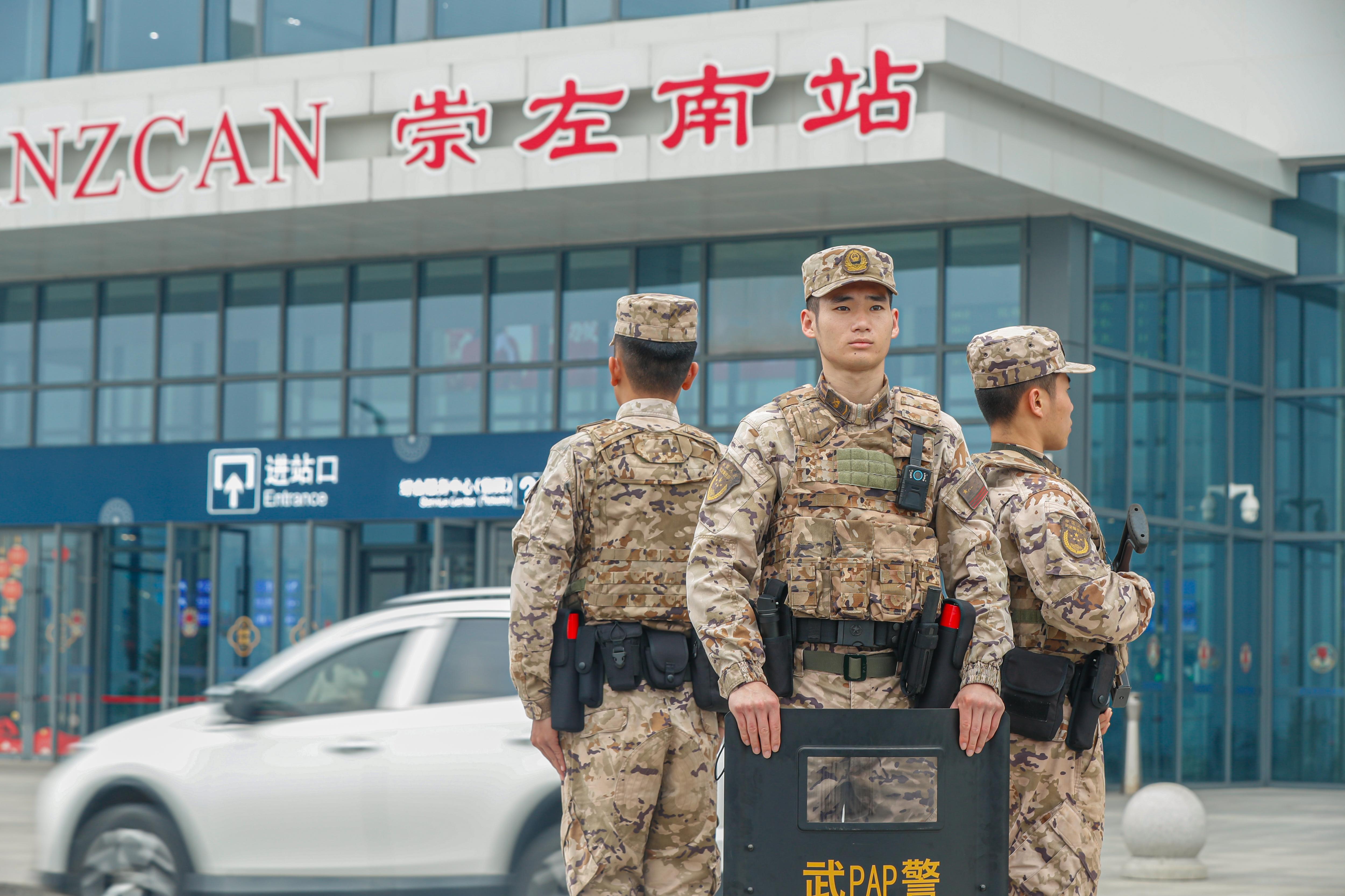 春节假期期间,武警广西总队崇左支队官兵坚守执勤一线,在高铁站、景区等重点区域开展武装巡逻,维护秩序、服务群众,用忠诚守护南疆国门平安,以“敬业福”守护万家“平安福”。