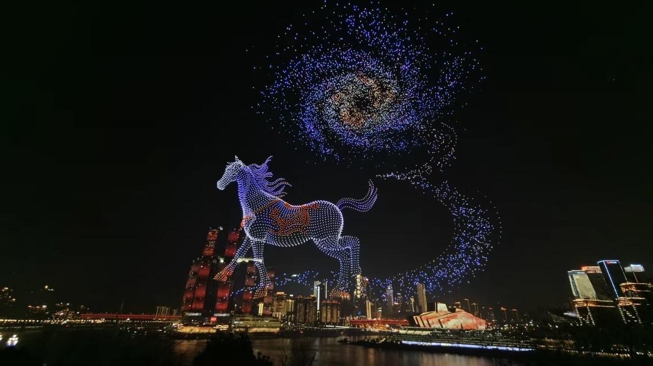 夜经济成为春节消费的核心引擎。从农历腊月二十八至正月初六,“新韵重庆”大型无人机灯光秀在两江四岸持续上演,以“赛博年味”拉开山城春节序幕。除夕夜,万架无人机群腾空而起,在山茶花、奔腾骏马、熊猫送福及蜀绣样式的重庆地标画卷等绝美图景变换中,献上一场“空中年夜饭”,引得市民游客争相打卡。
