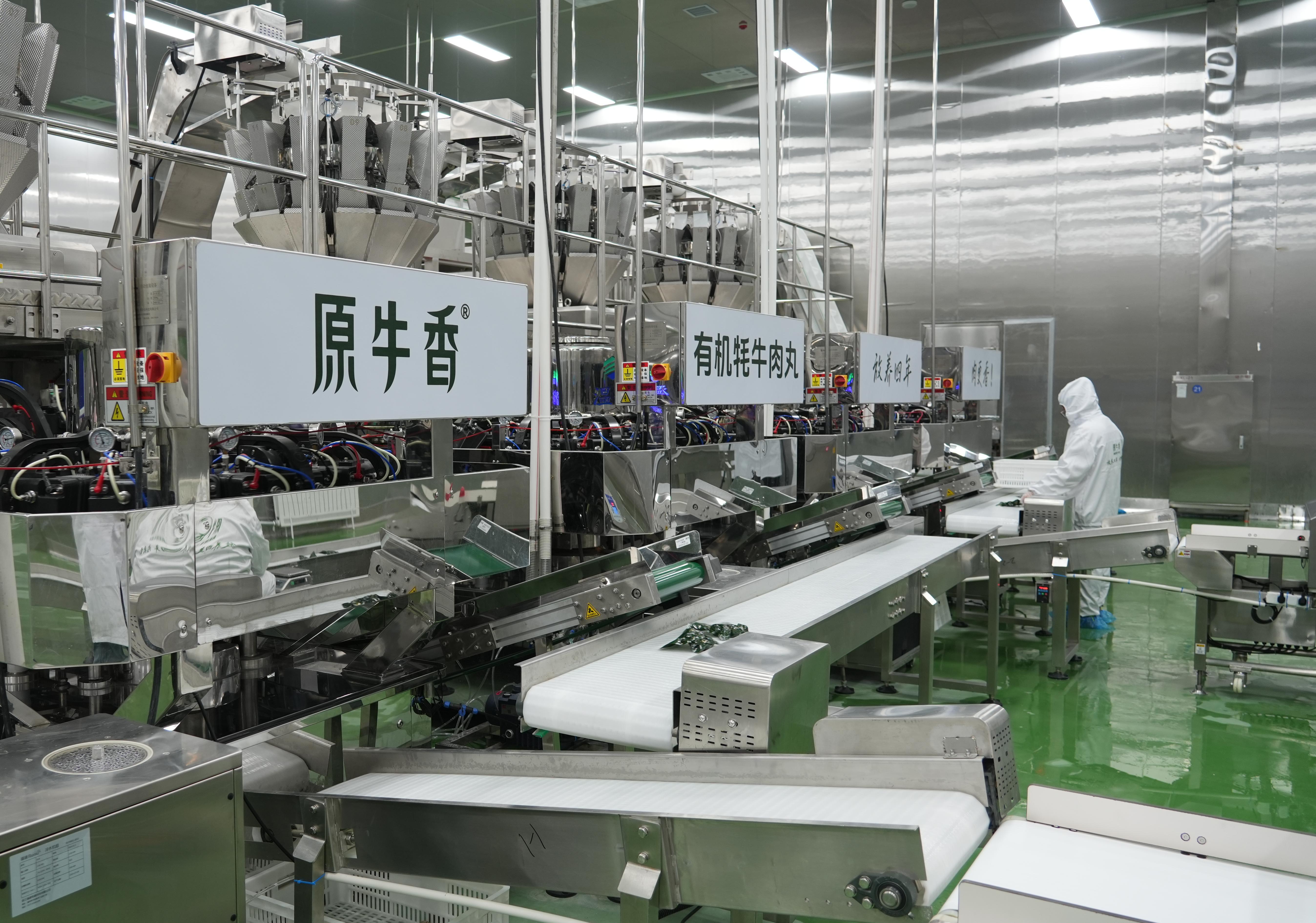 在全长约300米的全自动化牦牛肉丸生产线上,一块块经过严格检疫的新鲜有机牦牛肉,依次完成去骨、去油、剔筋膜等精细处理流程后,在精准温控下,再经过打浆、定型、熟化和风冷等自动化流程,变身为一颗颗牦牛肉丸。它们在输送带上“列队”行进,犹如跳动的“高原红珍珠”。“你看,从牦牛屠宰到成品牦牛肉丸生产,整个过程不超过4小时。我们还专门建设了屠宰厂和分割生产线,让牦牛肉丸达到最佳口感。”原牛香食品生产总监杨艺勇指着飞速运转的设备向记者介绍,“我们通过速冻螺旋急速锁鲜技术,能够在25分钟内将牦牛肉丸中心温度迅速降至零下18摄氏度,最大程度锁住牦牛肉特有的鲜美与营养。达产后,公司一天最高可稳定产出30吨高品质牦牛肉丸。”