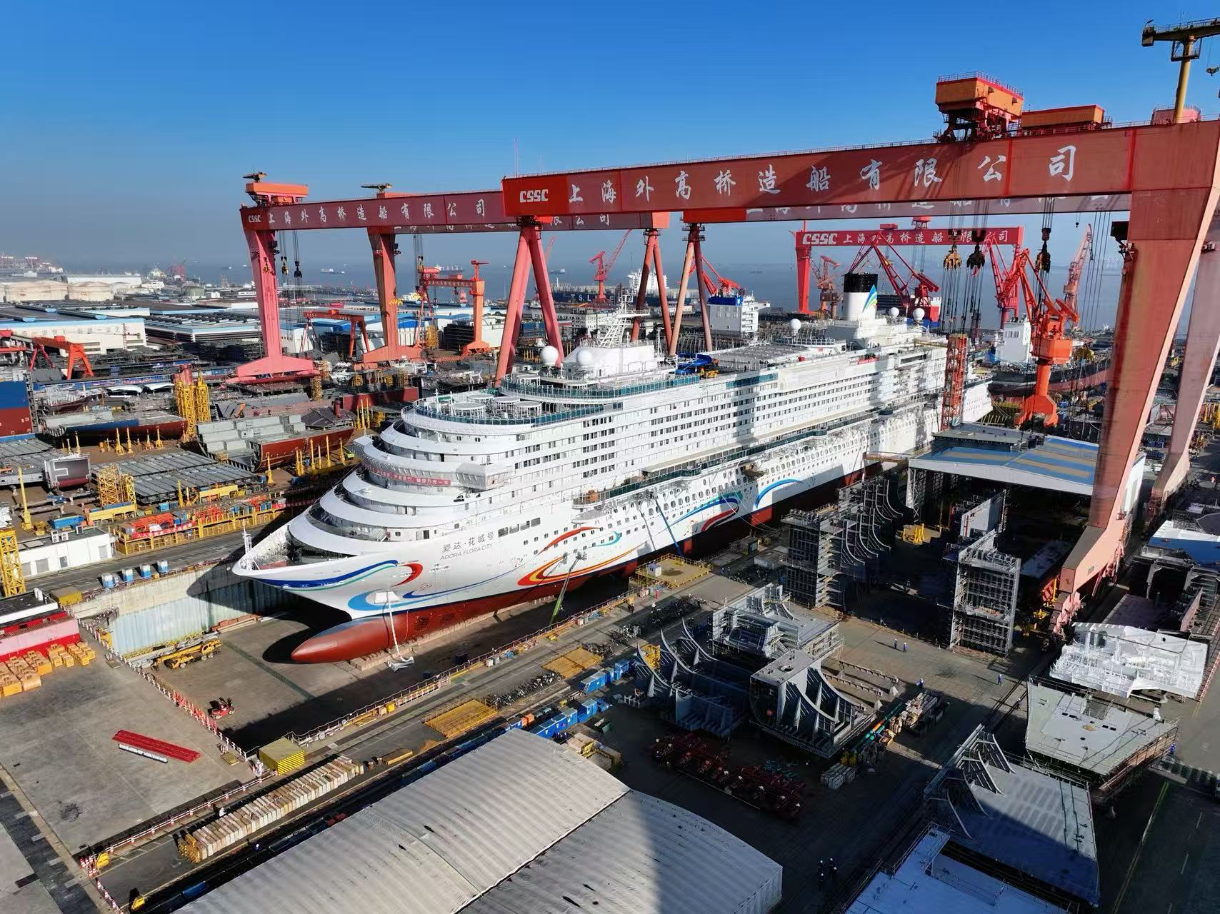 2月27日,科技日报记者从中国船舶集团获悉,我国第二艘国产大型邮轮“爱达·花城号”目前建造进展顺利,计划于3月中旬出坞,转入码头系泊调试阶段。按计划,该船将于5月底出海试航,2026年底前正式交付。