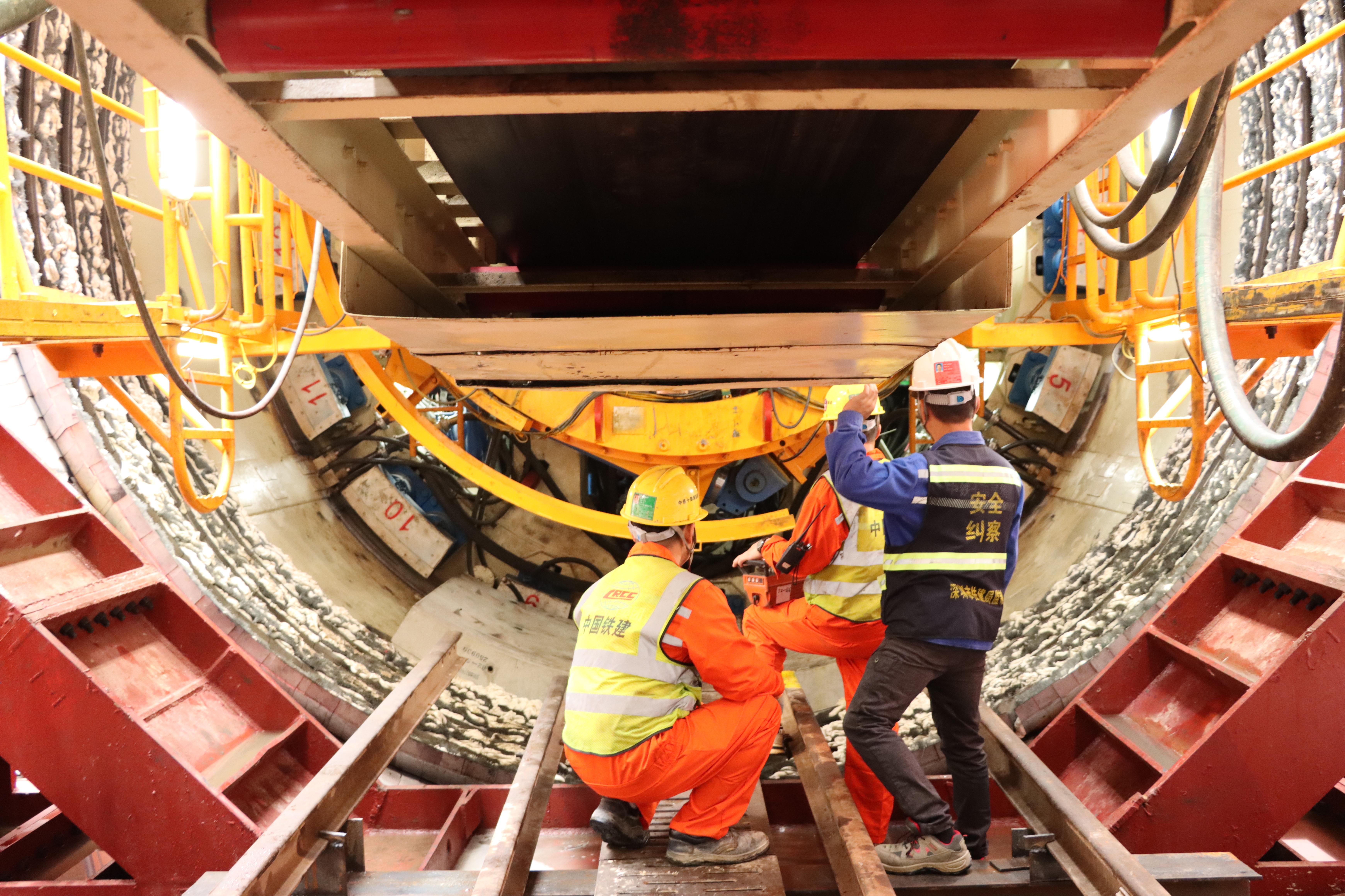 此次首批始发的两个区间盾构,均为全线控制性关键节点工程。西丽高铁站—文光站区间右线,投入“开拓一号”复合式土压平衡盾构机掘进。该机全长85米,开挖直径6.46米,承担区间459.9米隧道施工任务。长岭陂站—北站西广场站区间左线,投入“奋进号”土压平衡盾构机掘进。该机总长82米,开挖直径6.45米,承担区间2177.7米隧道施工任务。