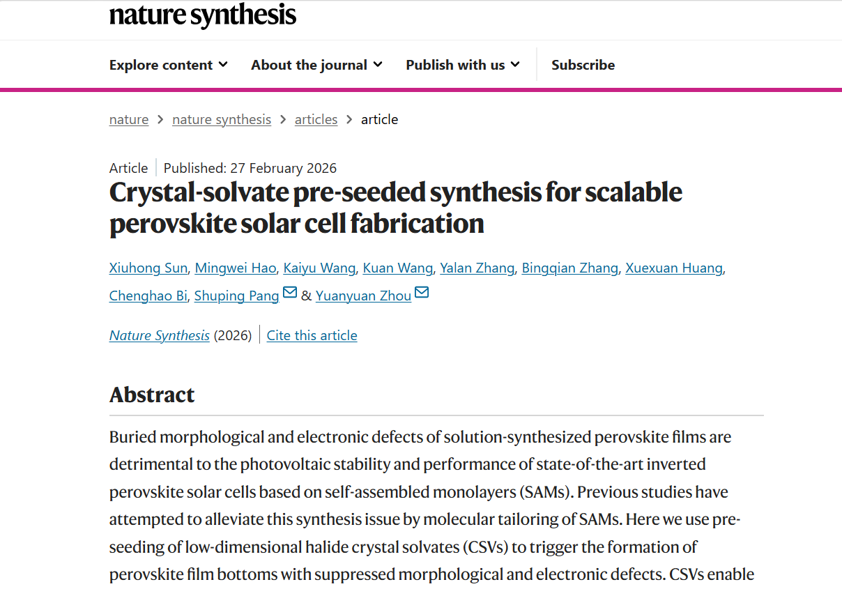 2月28日,记者从中国科学院青岛生物能源与过程研究所获悉,该所联合香港科技大学研究团队,在钙钛矿太阳能电池埋底界面工程领域取得重要突破。他们首创“溶剂化物晶体预晶种”策略,为钙钛矿光伏组件实现高效、可规模化生产带来新希望。相关研究成果已于27日在国际学术期刊《自然·合成》发表。