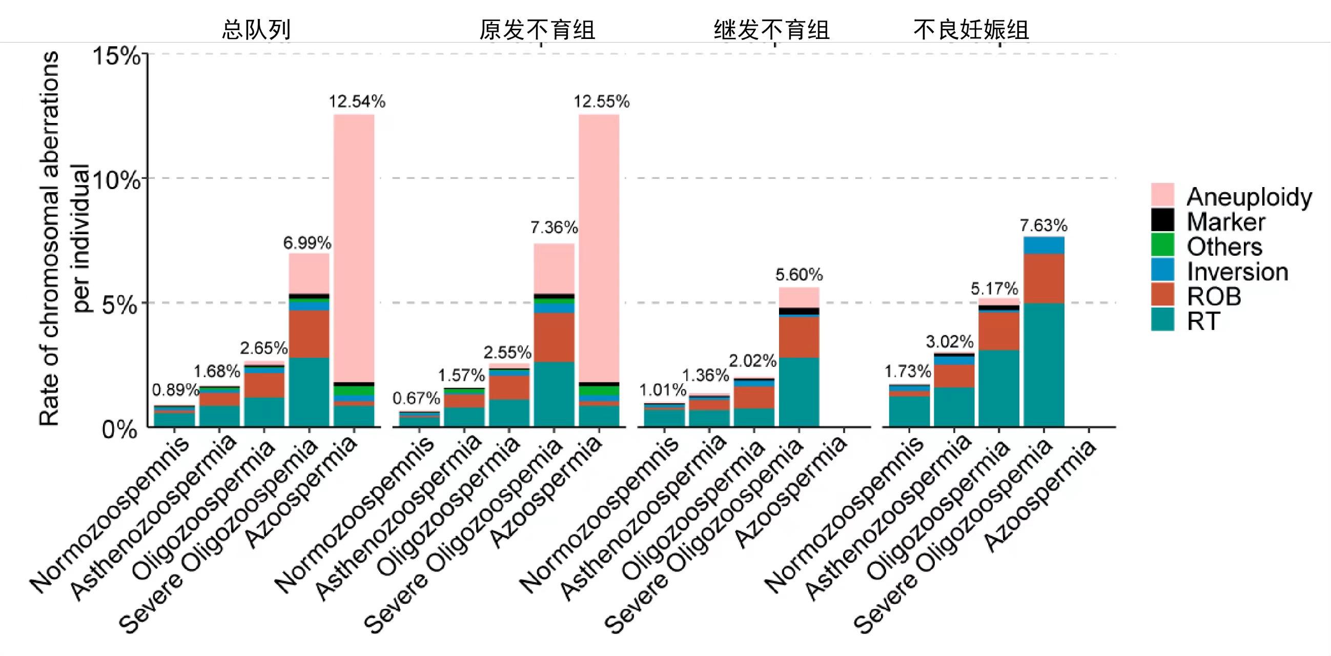 研究提示了男性生育的关键警示信号:精液质量越差,染色体异常率越高。其中,无精子症患者的染色体异常率高达12.54%,是精液参数正常男性的15倍之多,这为男性不育的病因排查提供了重要方向。