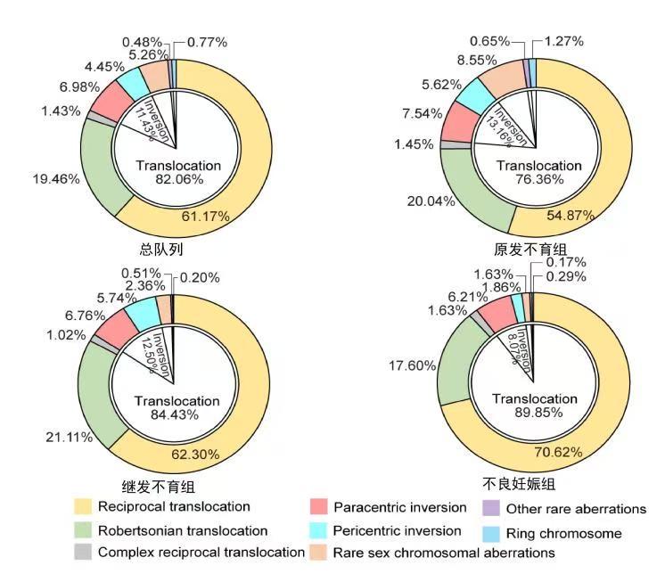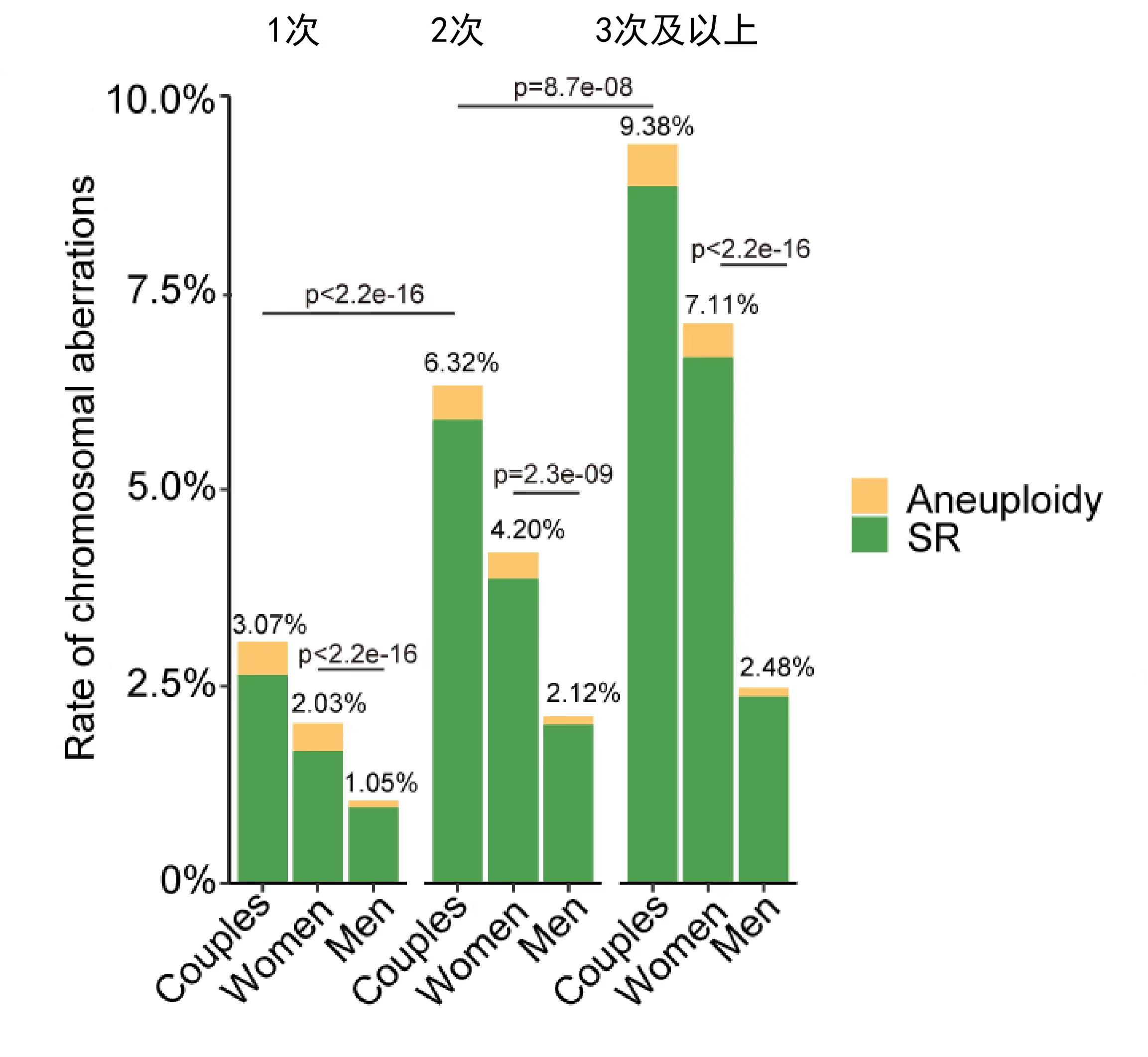 研究明确了寻求ART助孕人群的染色体异常发生率为3.42%。其中,有流产史的夫妇染色体异常率高达4.83%,明显高于原发不育(3.54%)和继发不育(2.18%)的夫妇。有3次及以上流产史的夫妇,异常率达9.38%,相当于普通ART人群的3倍。