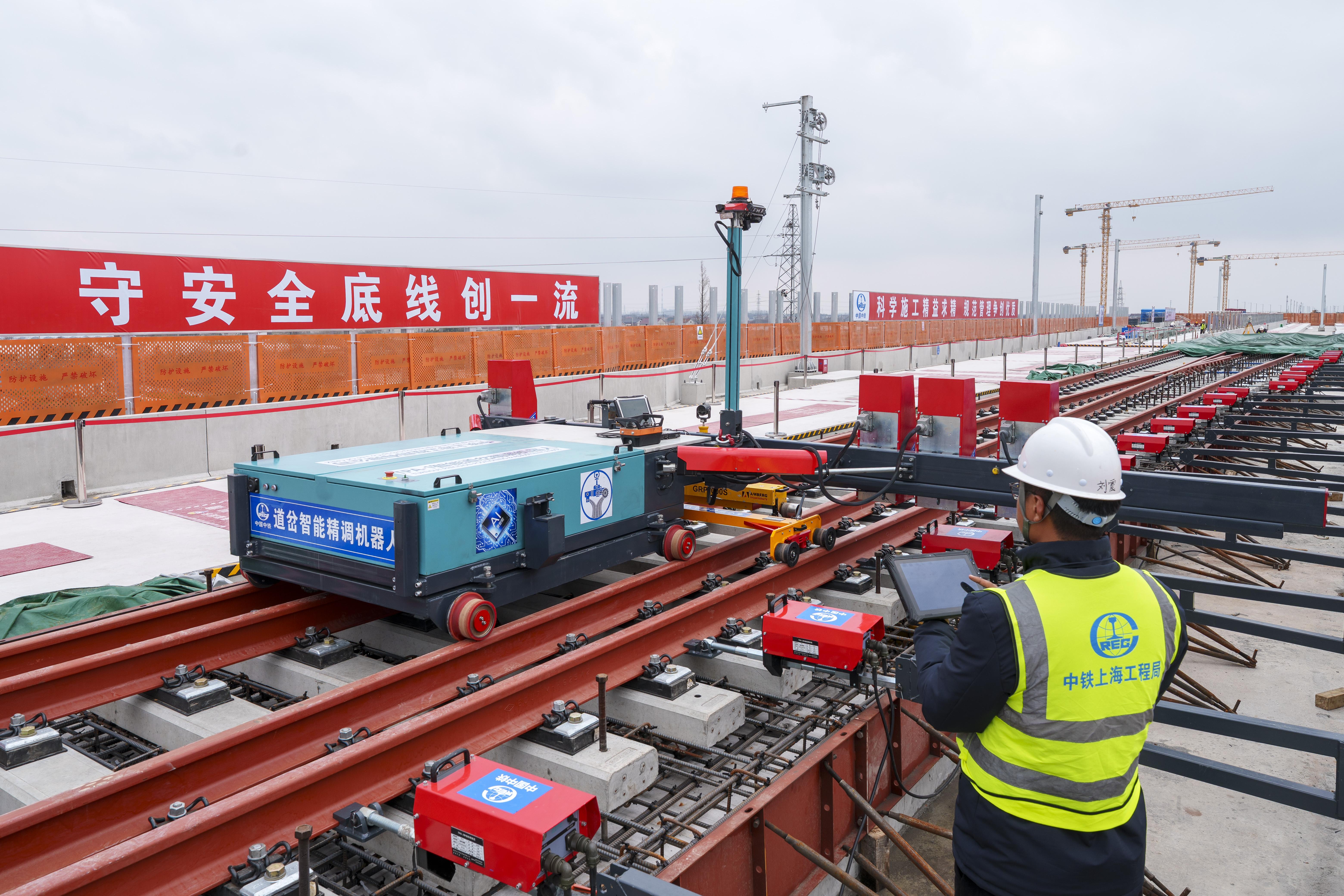 3月2日,在建设中的上海至南京至合肥高速铁路沪宁段站前Ⅵ标启东西站施工现场,中铁上海工程局自主研制的无砟轨道智能精调装备投入使用。这套国内首创的装备,实现了道岔精调从传统人工作业向智能化、数字化施工的跨越式升级,为高铁建设提质增效提供了新的技术支撑。