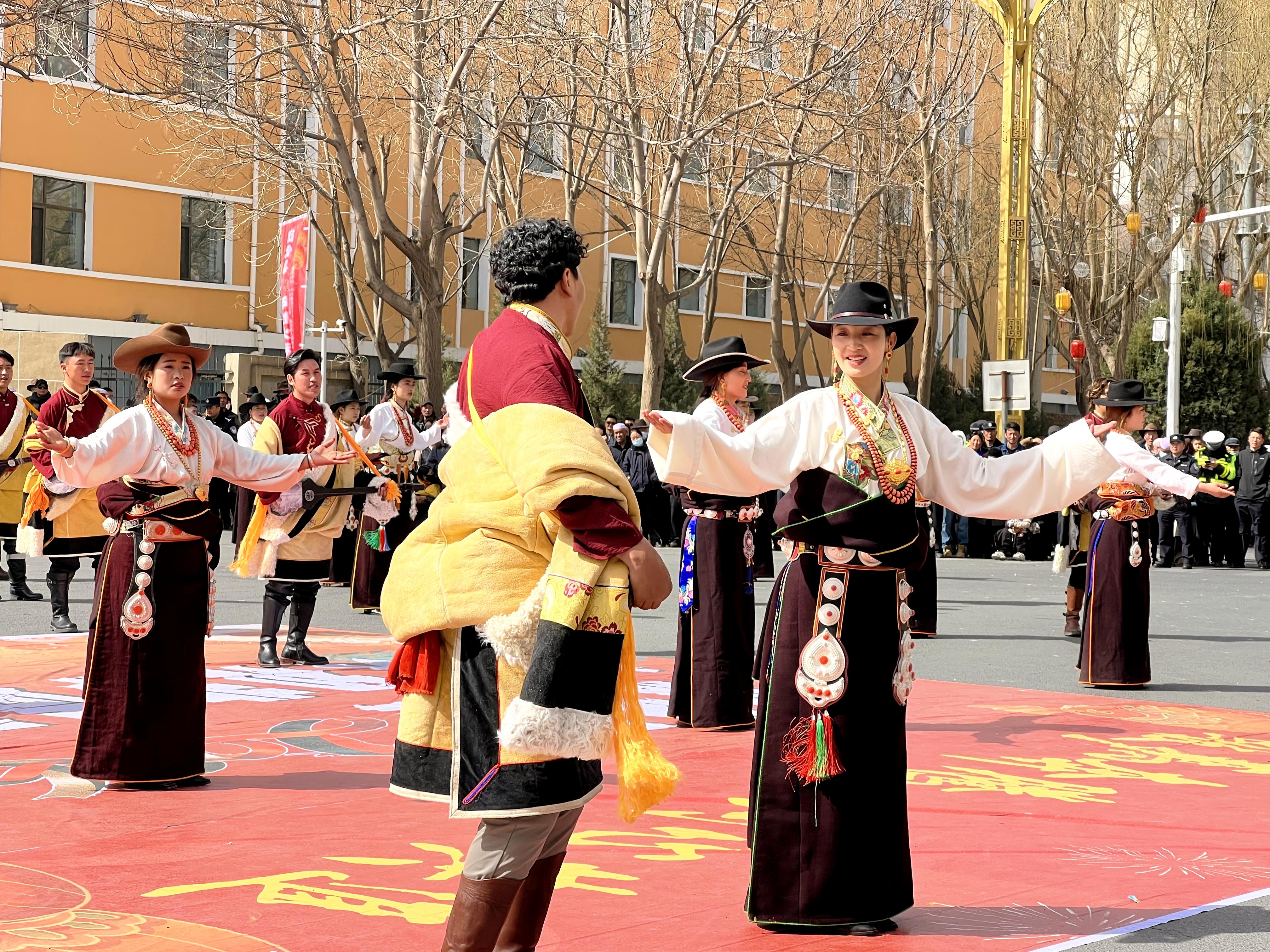 作为国家级非物质文化遗产代表性项目的撒拉族服饰表演,一针一线勾勒出浓郁的民族风情,服饰上的精美纹样承载着撒拉族的历史记忆与文化内涵,成为现场最亮眼的风景之一;道帏乡的螭鼓舞同样是国家级非物质文化遗产代表性项目,表演者身着传统服饰,以古朴庄重的舞姿、整齐划一的动作,展现出深厚的藏族文化底蕴,传递着藏族群众对美好生活的向往;道帏乡吉祥牦牛舞作为当地特色非遗表演,寄寓国泰民安、五谷丰登。