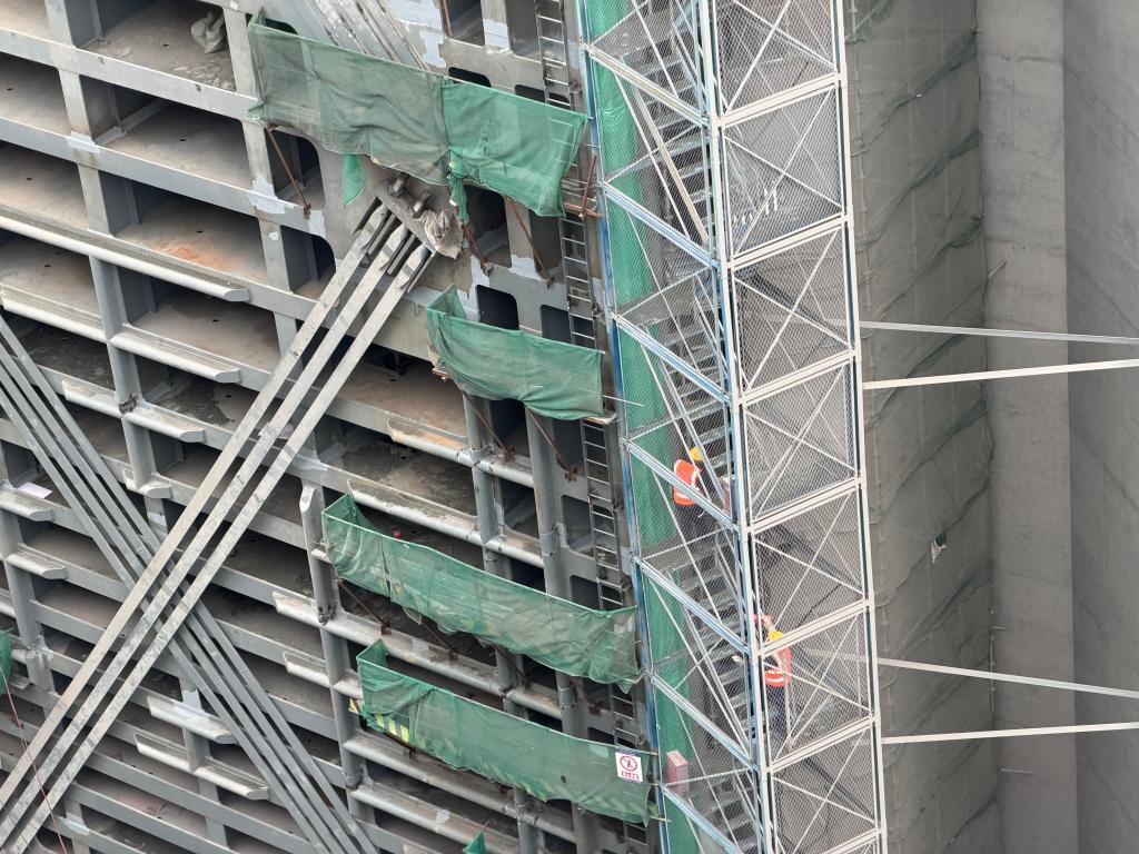 沿着安全梯向下,记者进入地下作业区。施工空间距离地面约60米。随着深度增加,四周逐渐被密集的钢筋结构包围。作业面钢筋交错,脚下是由钢筋搭建的格子通道,部分区域狭窄到只能侧身通过,施工环境颇具挑战。
